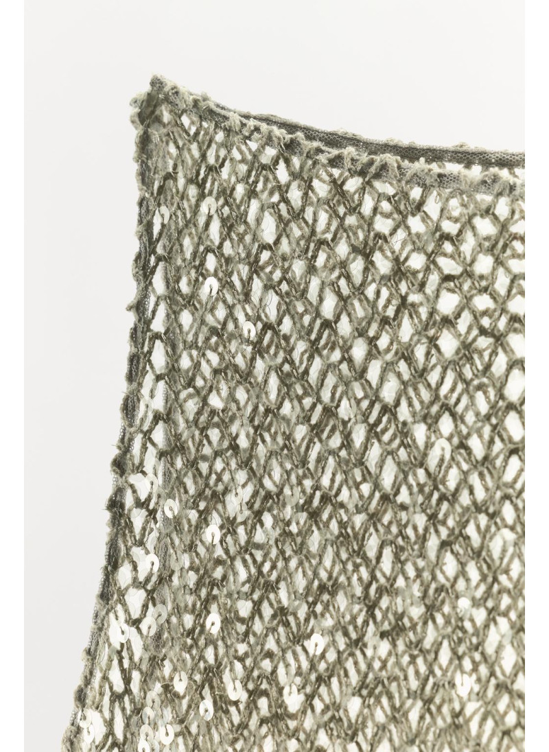 Полупрозрачный топ с лодочным вырезом, дизайном без рукавов и длинным рукавом, завершенный в форме буквы A. Украшен контрастными аппликациями из пайеток и асимметричным подолом...