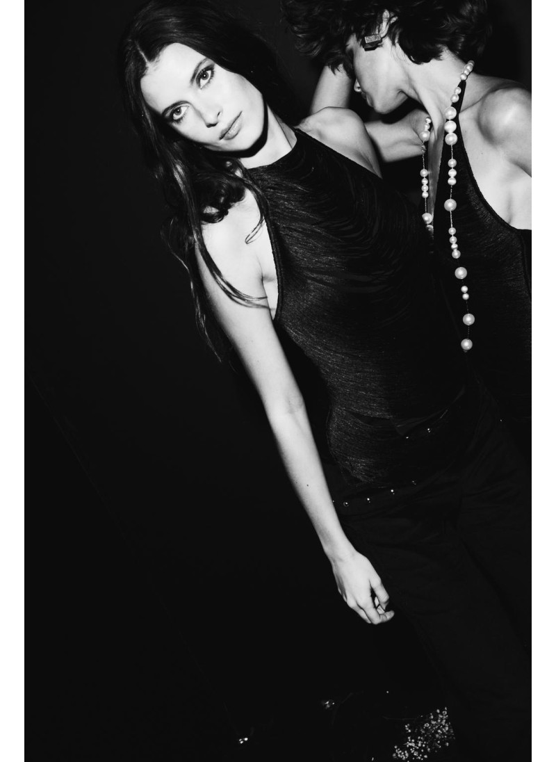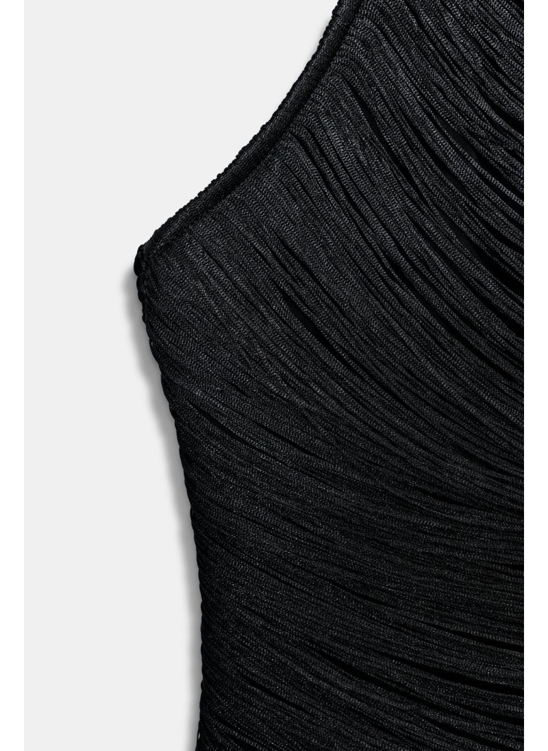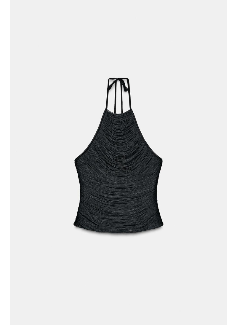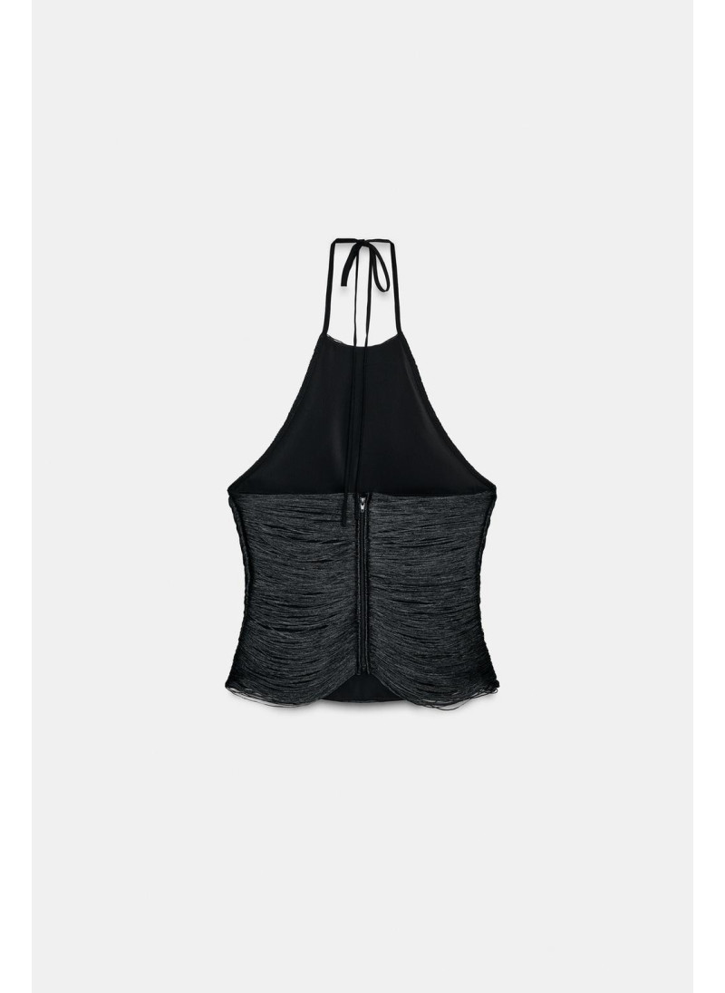 Регулируемый топ с завязками на шее. Открытые плечи. Тональная отделка из бахромы. Внутренняя подкладка. Застегивается на спине с помощью скрытой молнии по шву...