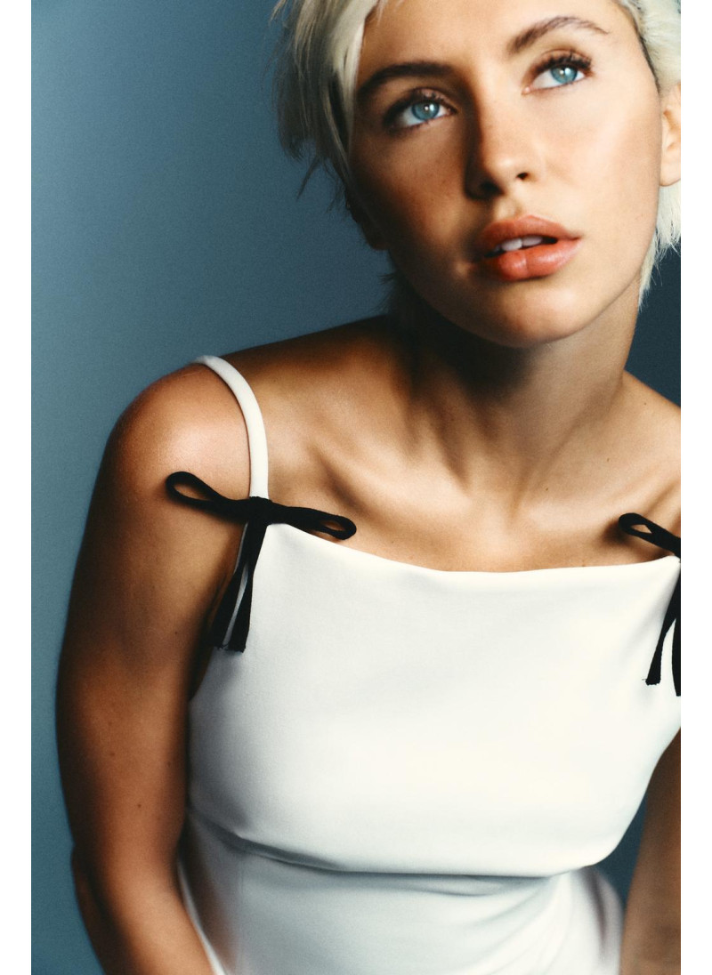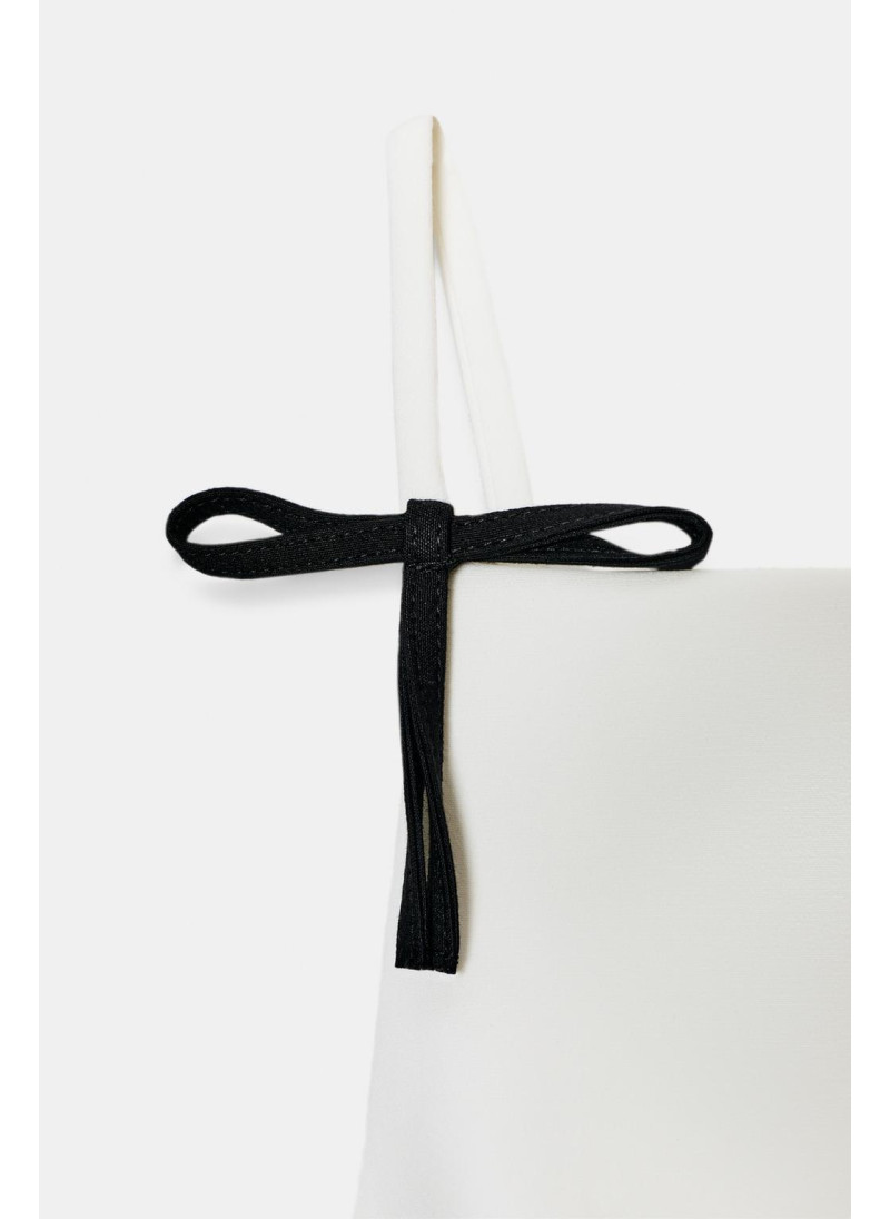 Облегающий топ с прямым вырезом и тонкими бретельками с аппликациями в виде бантов. Имеет подкладку. Застежка на молнию по боковому шву.