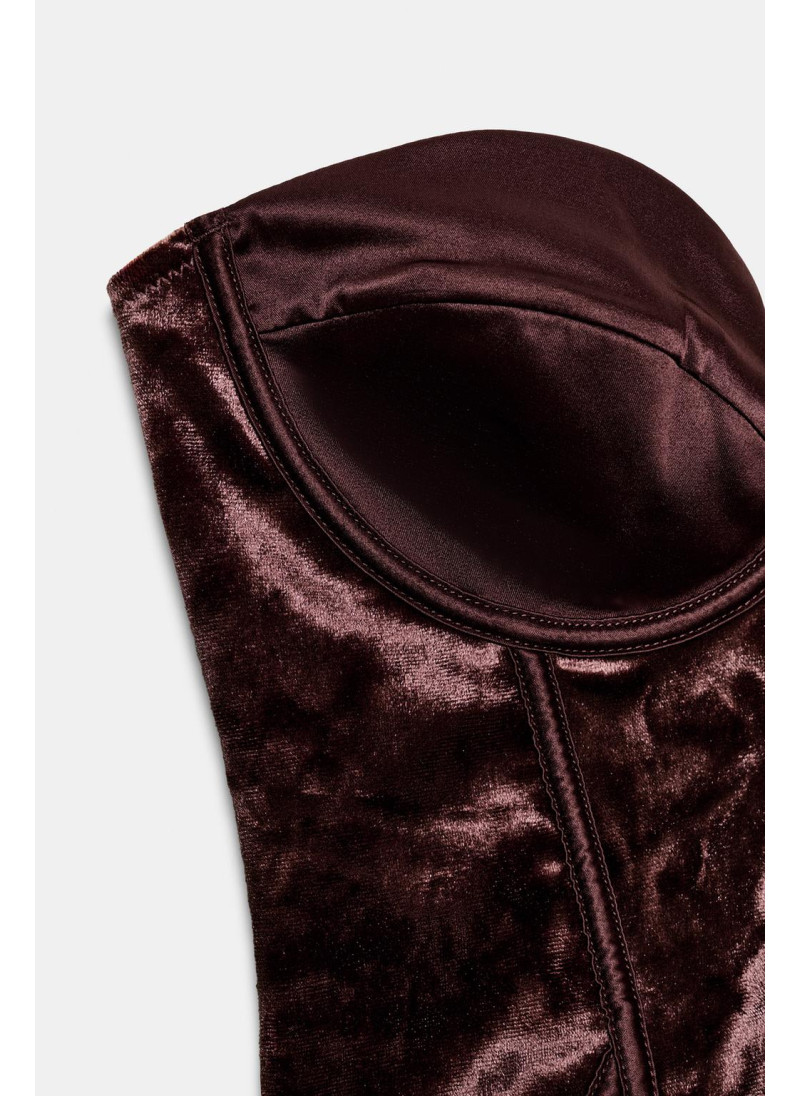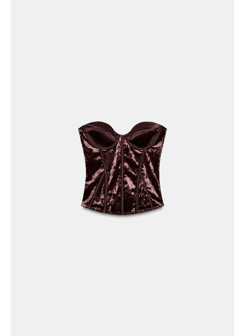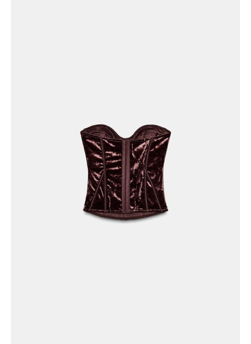 Корсет с поддержкой, изготовленный из бархатистой ткани. С открытими плечами. С застежкой на молнии по шву.