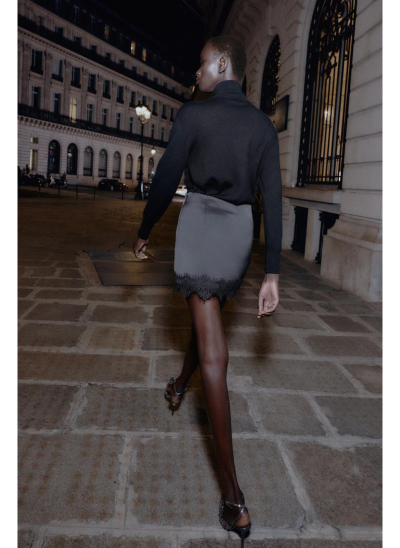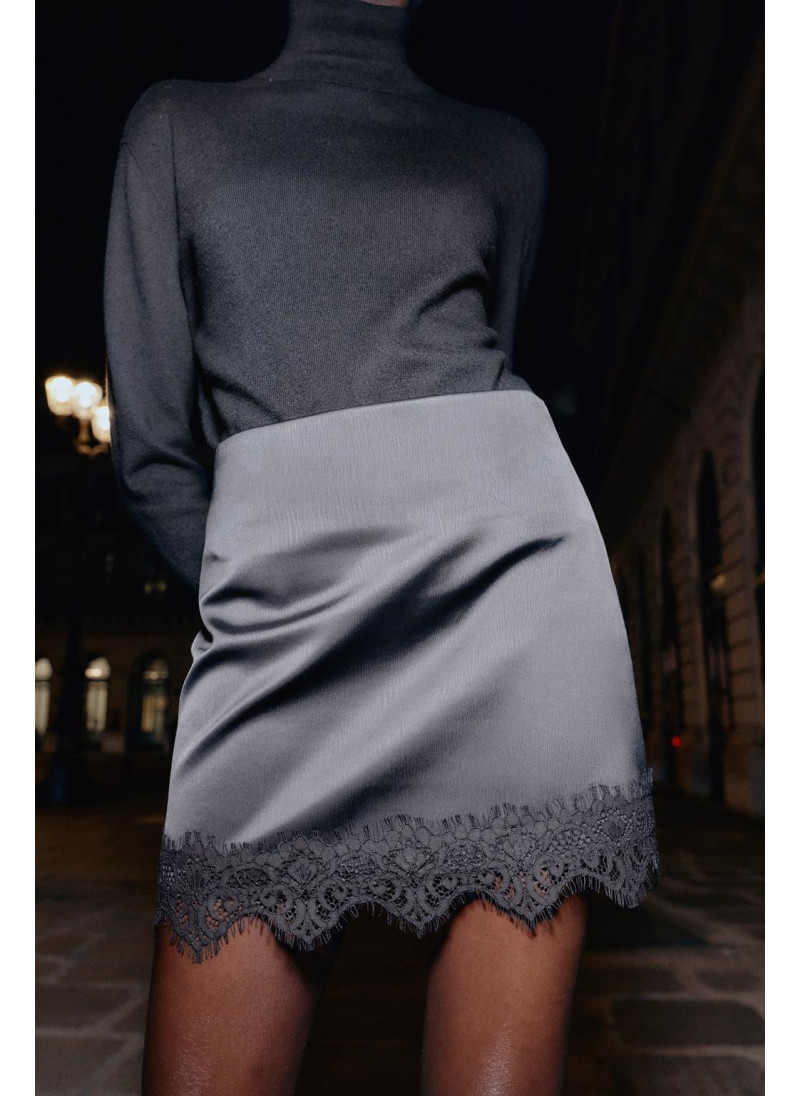 Юбка-шорты с высокой посадкой из атласной ткани с кружевной отделкой. Внутренняя подкладка. Потайная застежка-молния сбоку...