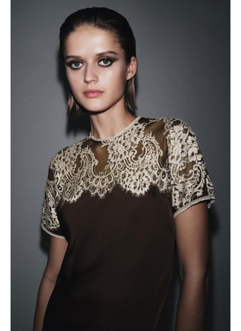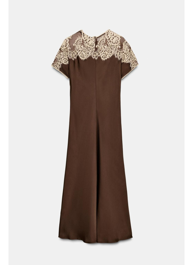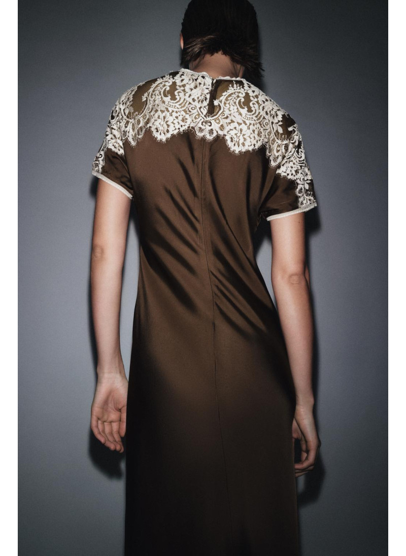Высота модели: 180 cm | Размер: S ZARA WOMAN COLLECTION Платье миди из вискозной пряжи. Круглый вырез и короткий рукав. Контрастные кружевные детали. Расклешенный низ. Застежка на спинке на пуговицу с разрезом...