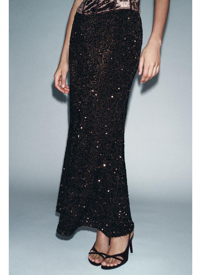 Высота модели: 180 cm | Размер: S Длинная юбка со средней посадкой. Пайетки. Расклешенный низ...