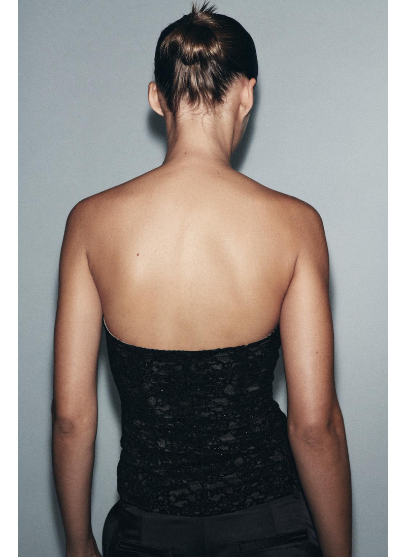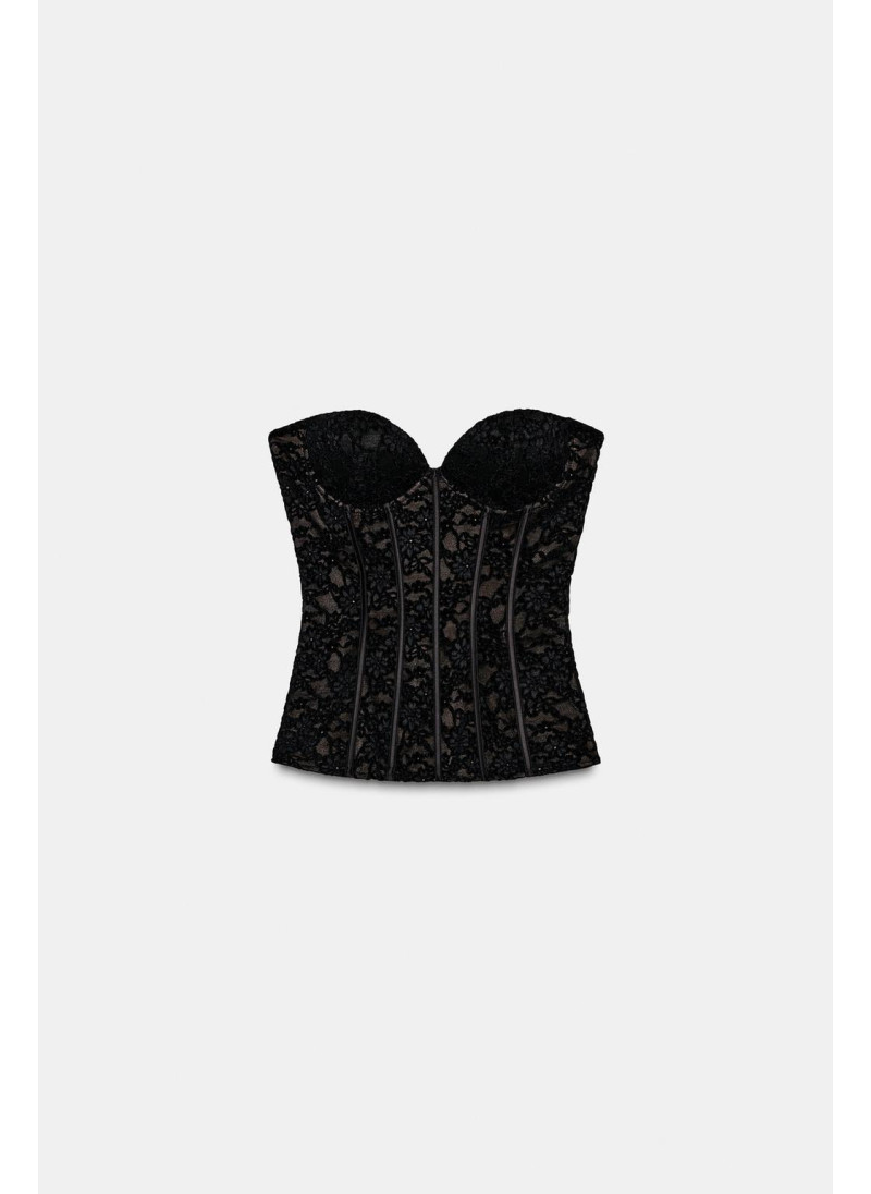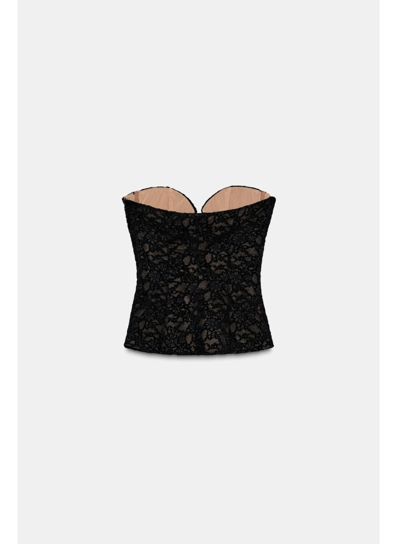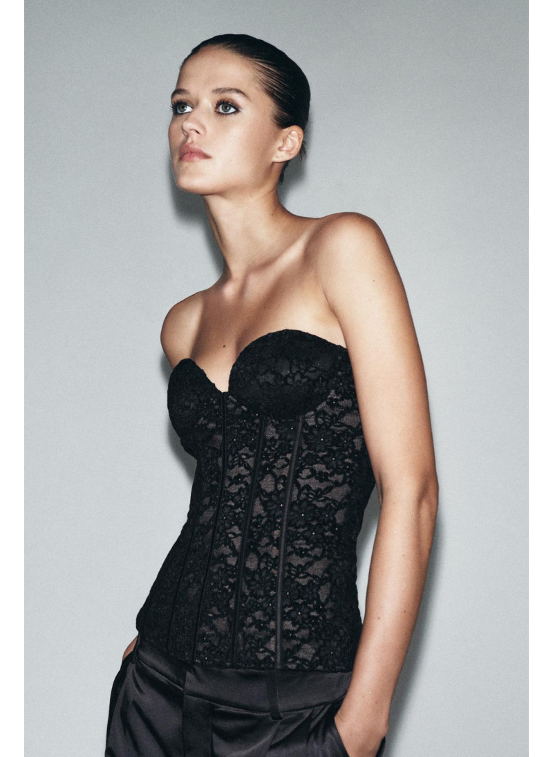 Высота модели: 180 cm | Размер: S Корсет без бретелей на косточках с открытыми плечами. Детали из кружева и бархата. Потайная застежка-молния в шве...