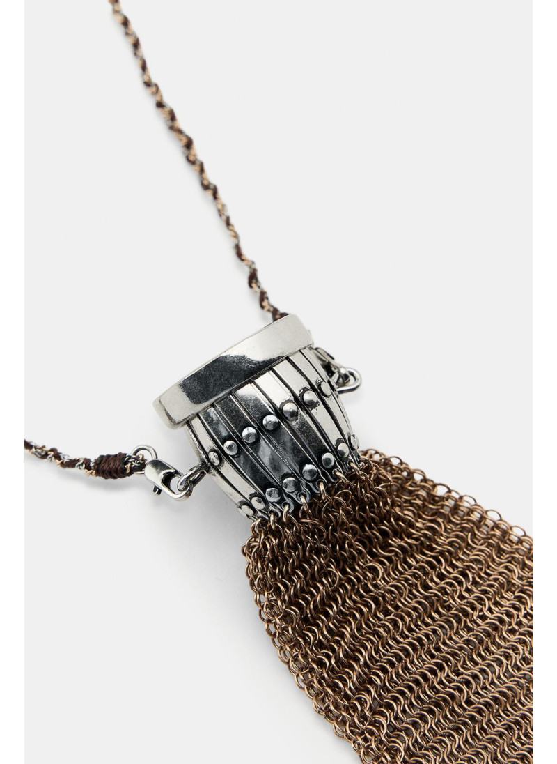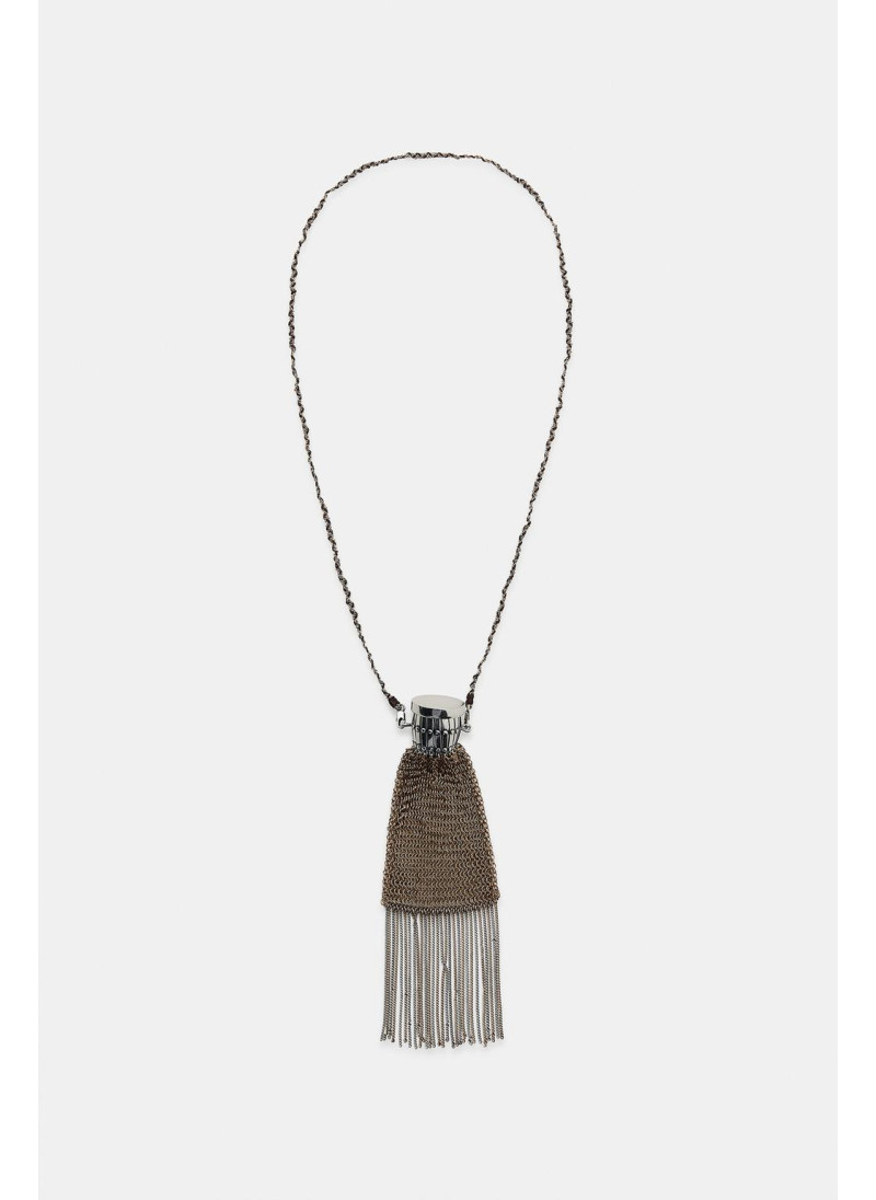 Длинное контрастное колье с несколькими металлическими звеньями и контрастной нитью. Прямоугольное ожерелье с подвеской-сумкой, выполненной в стиле цепочки с бахромой.
