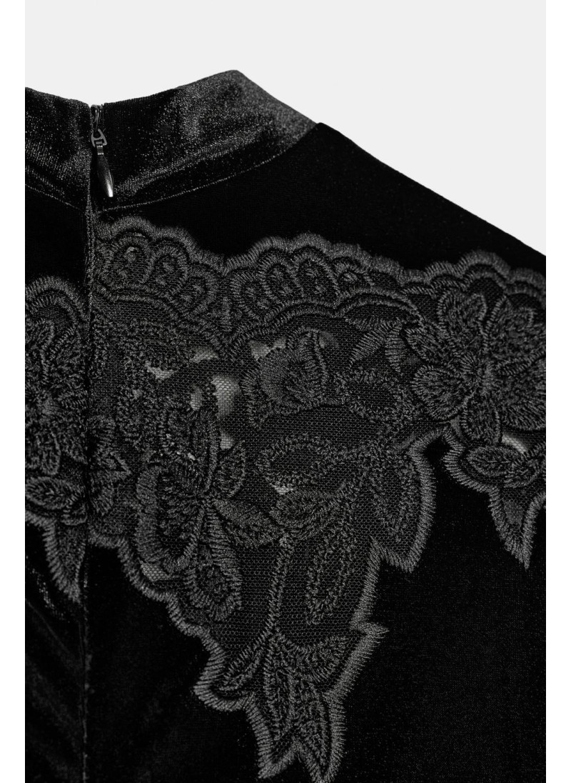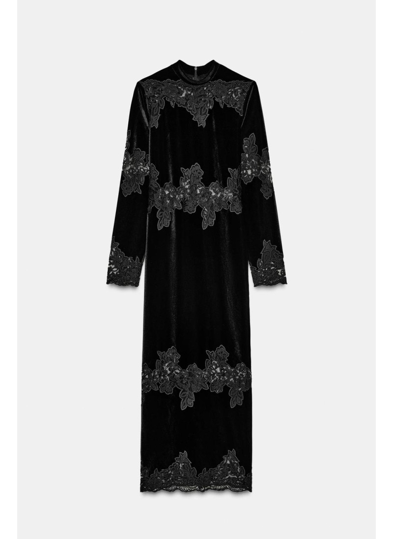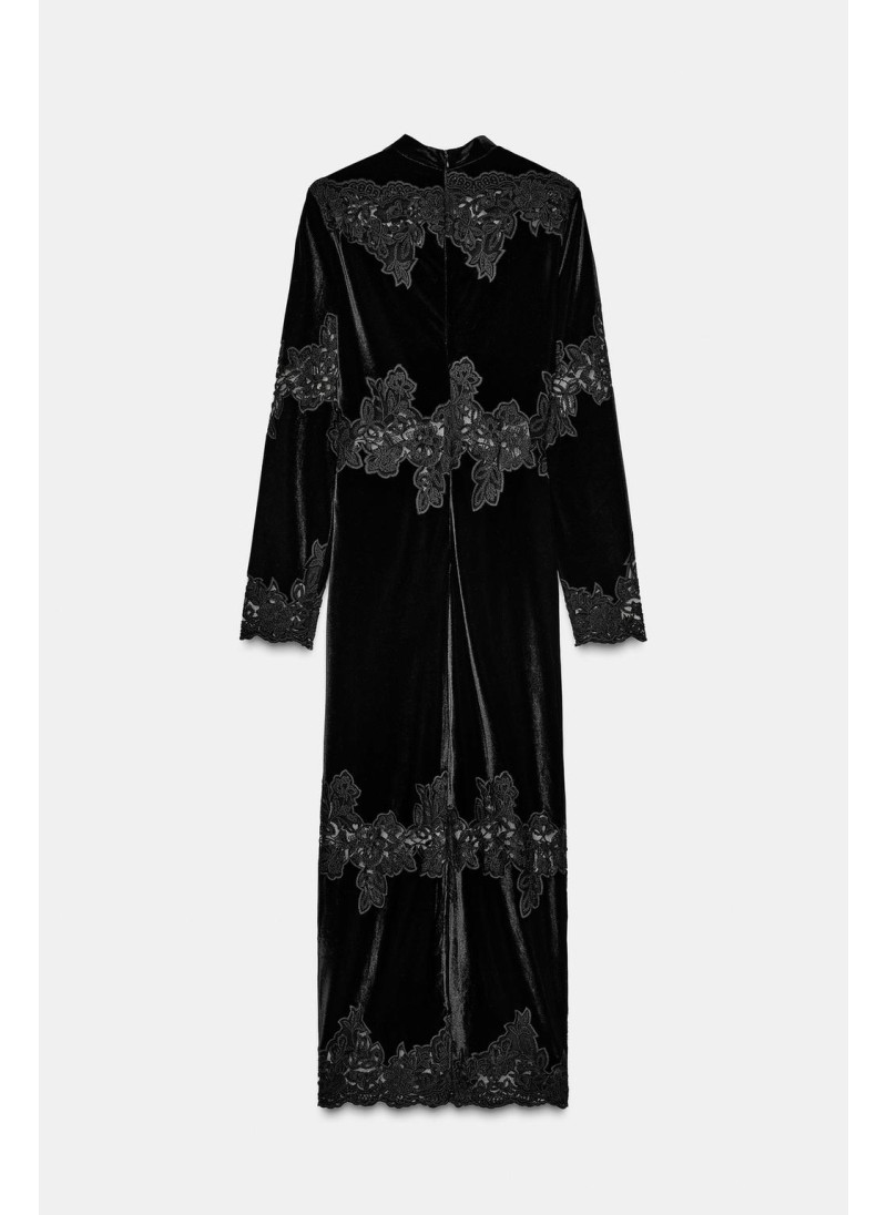 Платье миди с высоким воротником и длинными рукавами. Деталь из бархатной ткани с кружевом в тон. Разрез сзади. Потайная застежка-молния сзади.
