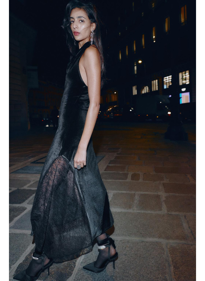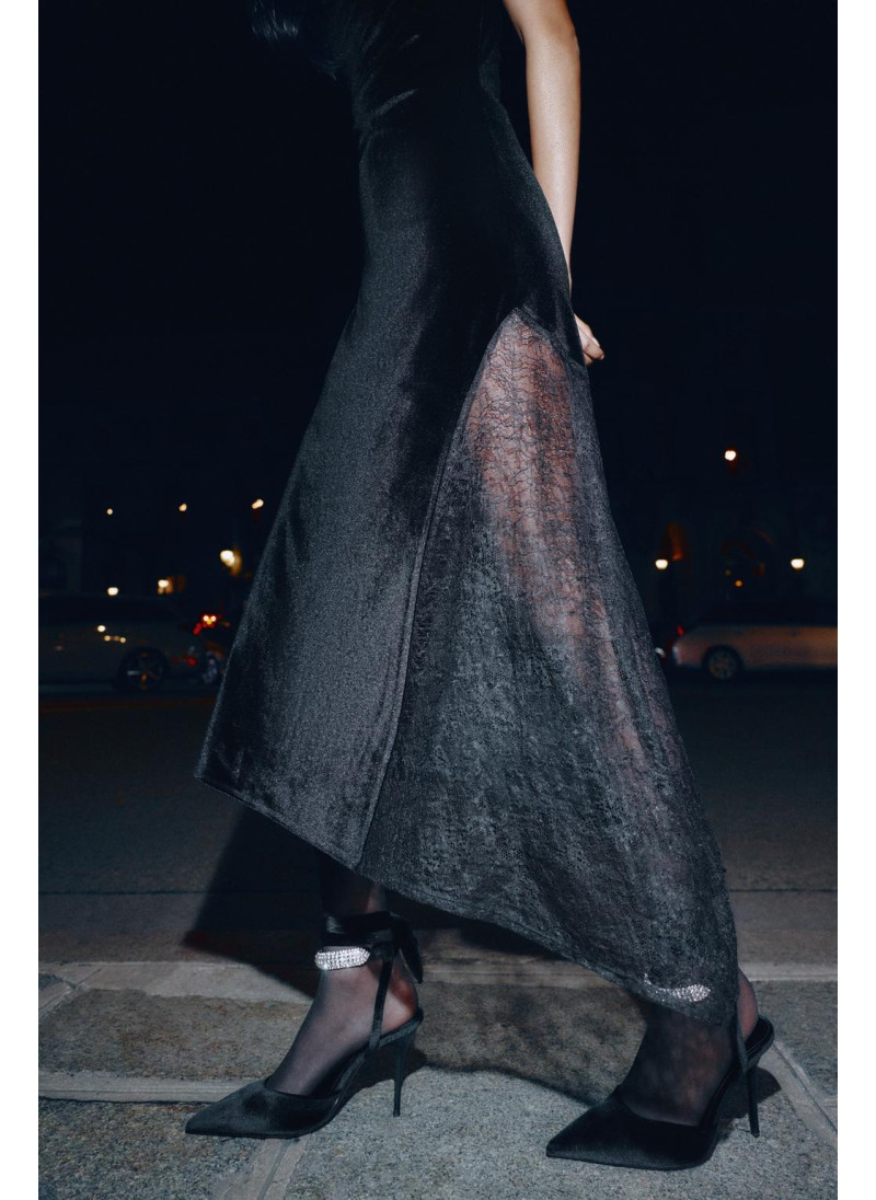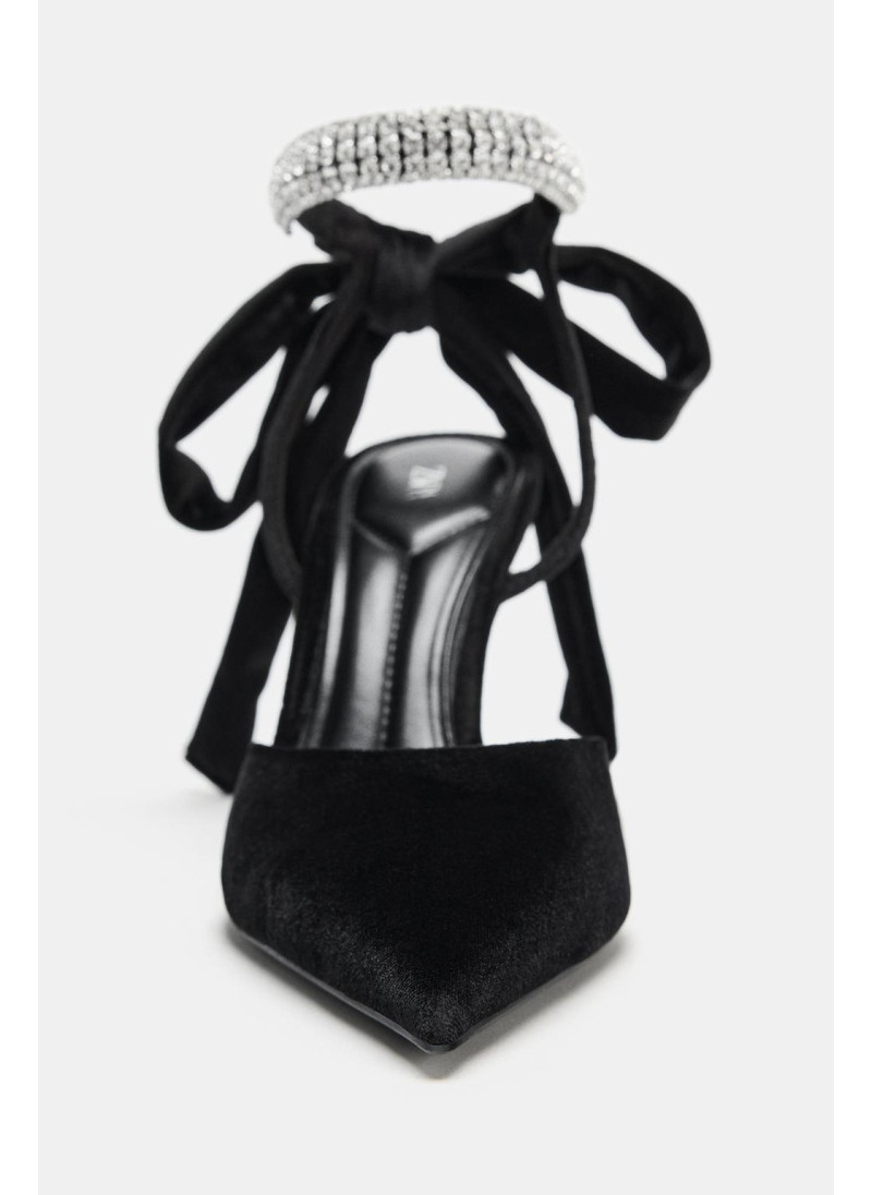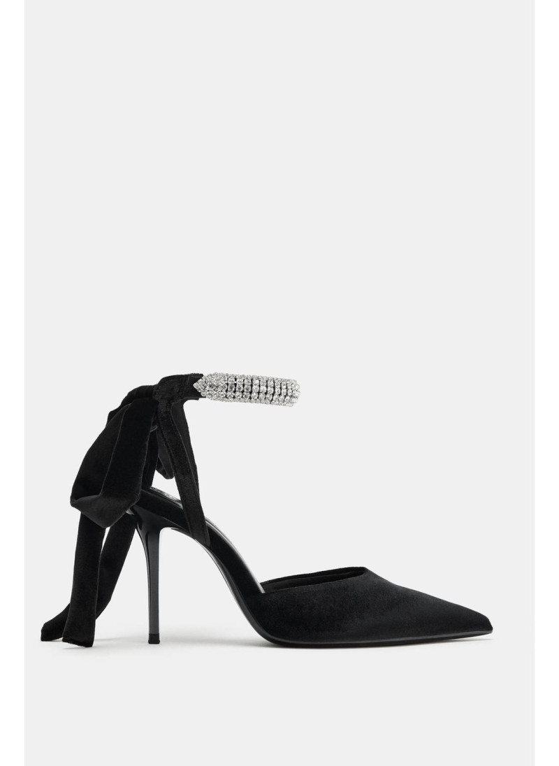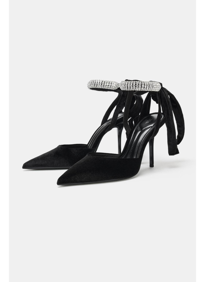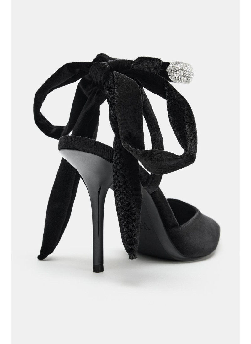 Туфли на тонком каблуке с верхом вельветовой текстуры. Регулируемый ремешок вокруг щиколотки с камнями и завязкой. Каблук стилет. Круглый вырез. Острый носок. Высота каблука: 10,5 см...