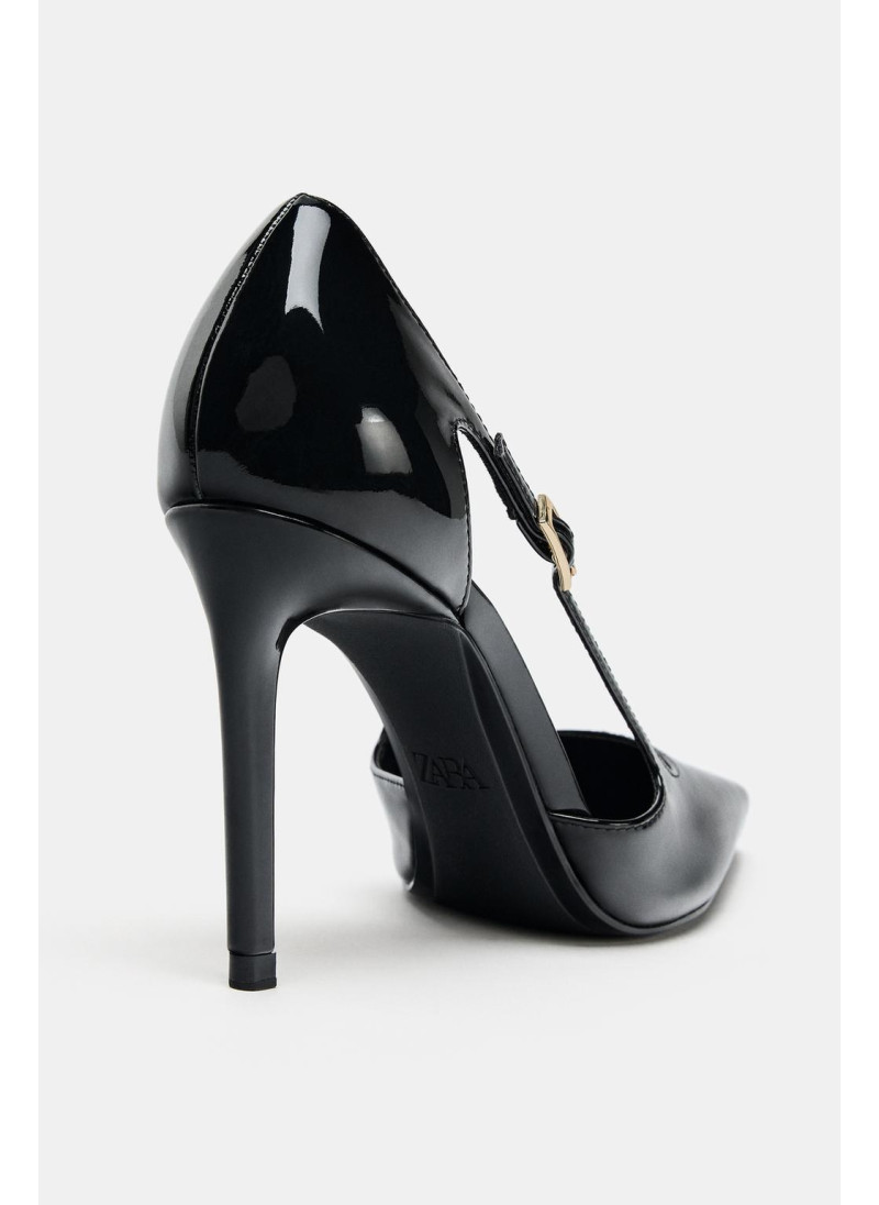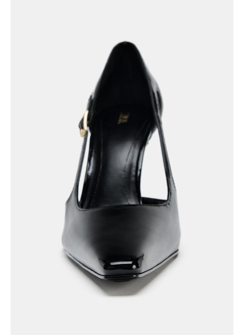 Туфли на высоком каблуке с лаковым эффектом. Детали с вырезами сбоку. Детали с металлической пряжкой. Высокий шпильковый каблук. Заостренный носок.