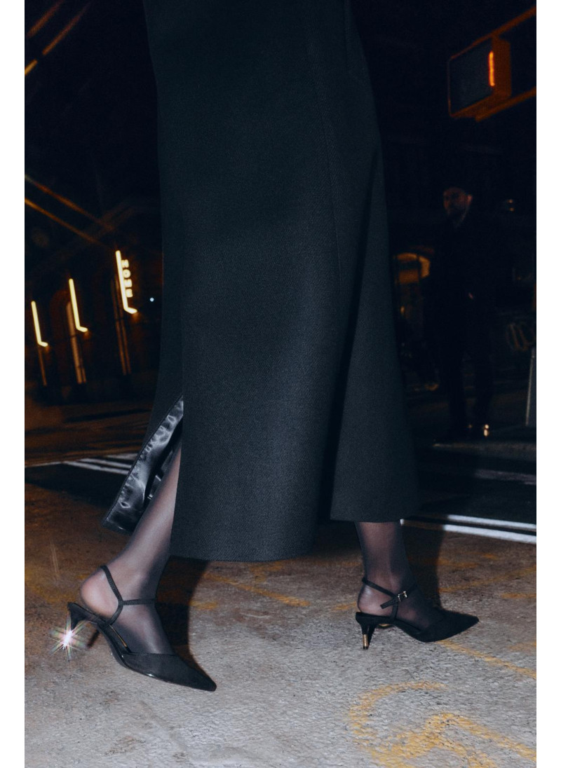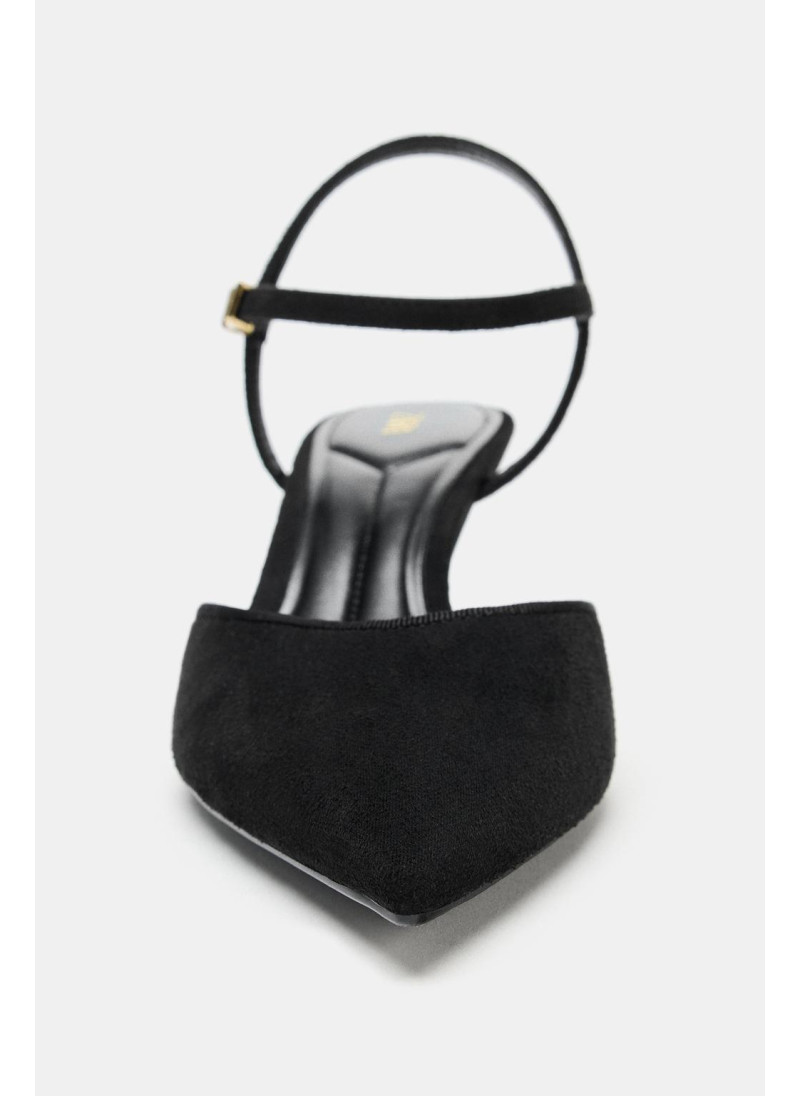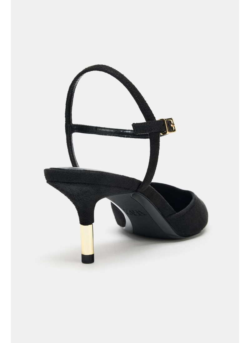 Высота модели: 173 cm | Размер: S Туфли на высоком каблуке без задников. Ремешок с пряжкой на щиколотке. Тонкий высокий каблук с металлической отделкой. Острый нос. Высота каблука: 7 см..