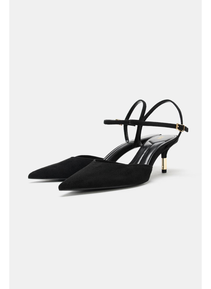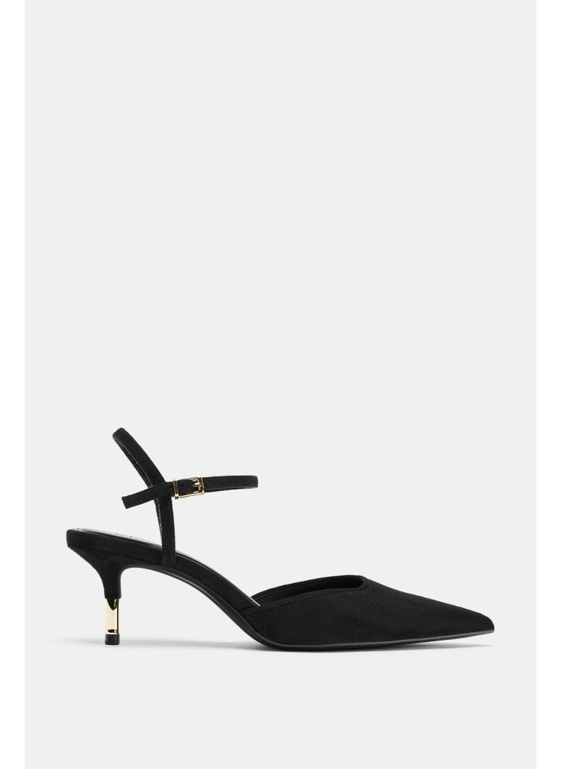 Туфли на высоком каблуке без задников. Ремешок с пряжкой на щиколотке. Тонкий высокий каблук с металлической отделкой. Острый нос.