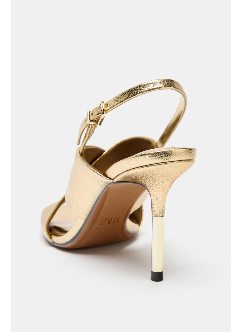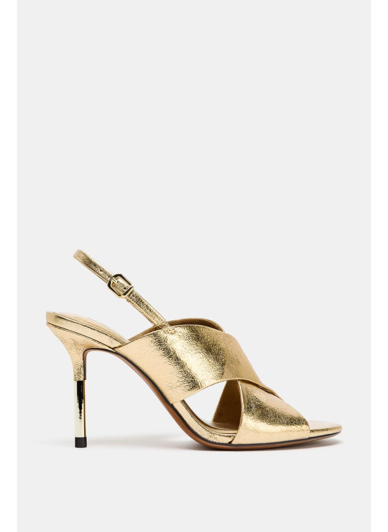 Босоножки с металлическим эффектом. Перекрещенные ремешки спереди. Высокий тонкий каблук. Ремешок с пряжкой на щиколотке. Заостренный носок. Высота каблука: 10 см..
