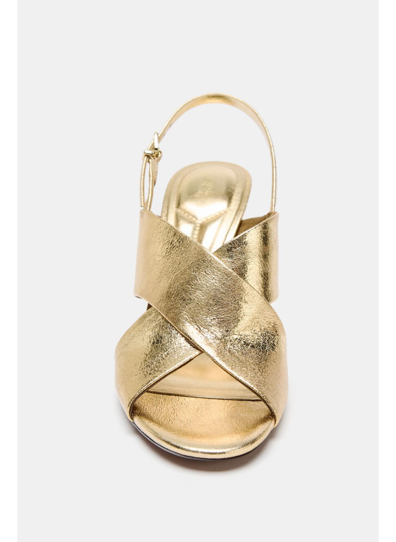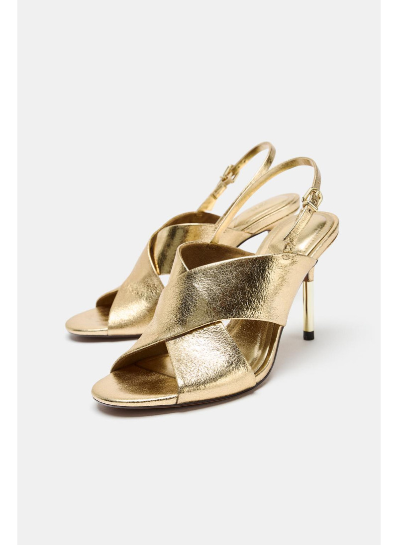 Босоножки с металлическим эффектом. Перекрещенные ремешки спереди. Высокий тонкий каблук. Ремешок с пряжкой на щиколотке. Заостренный носок.