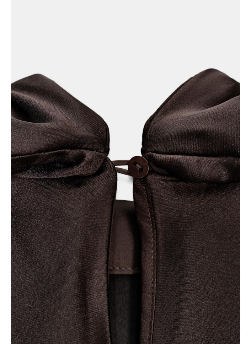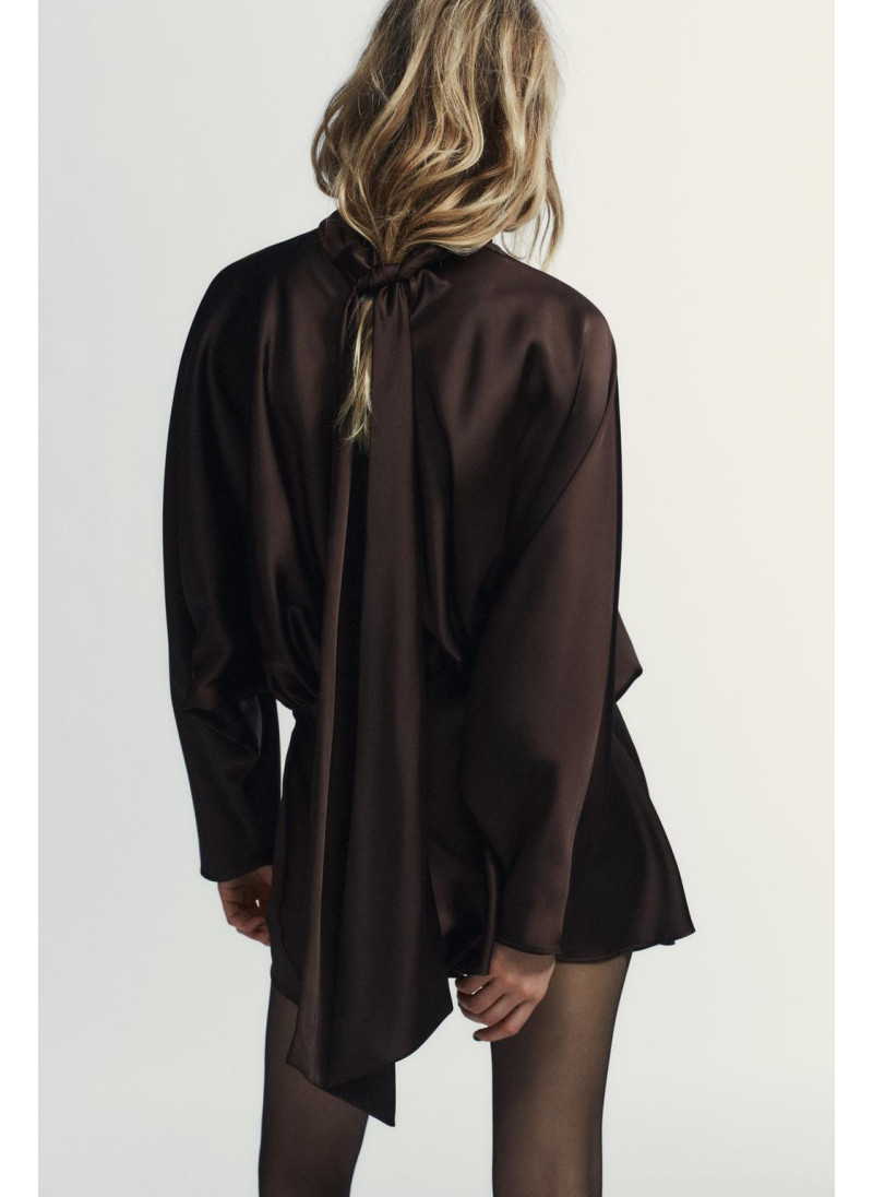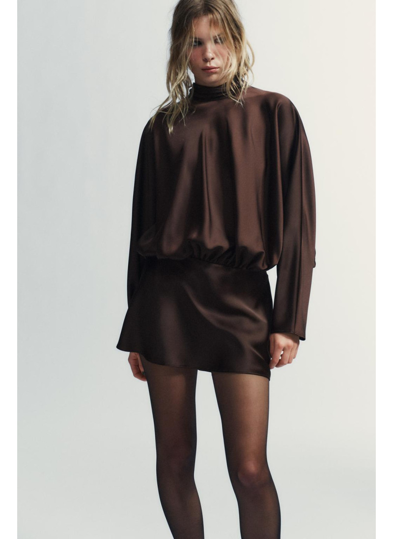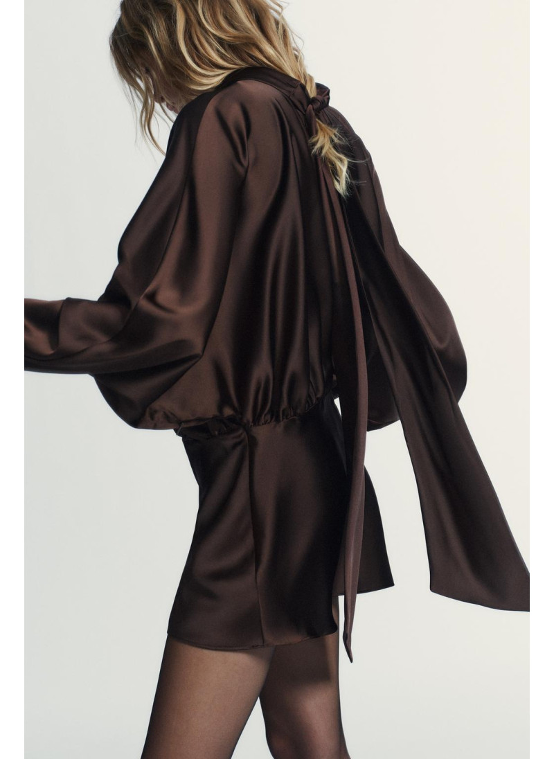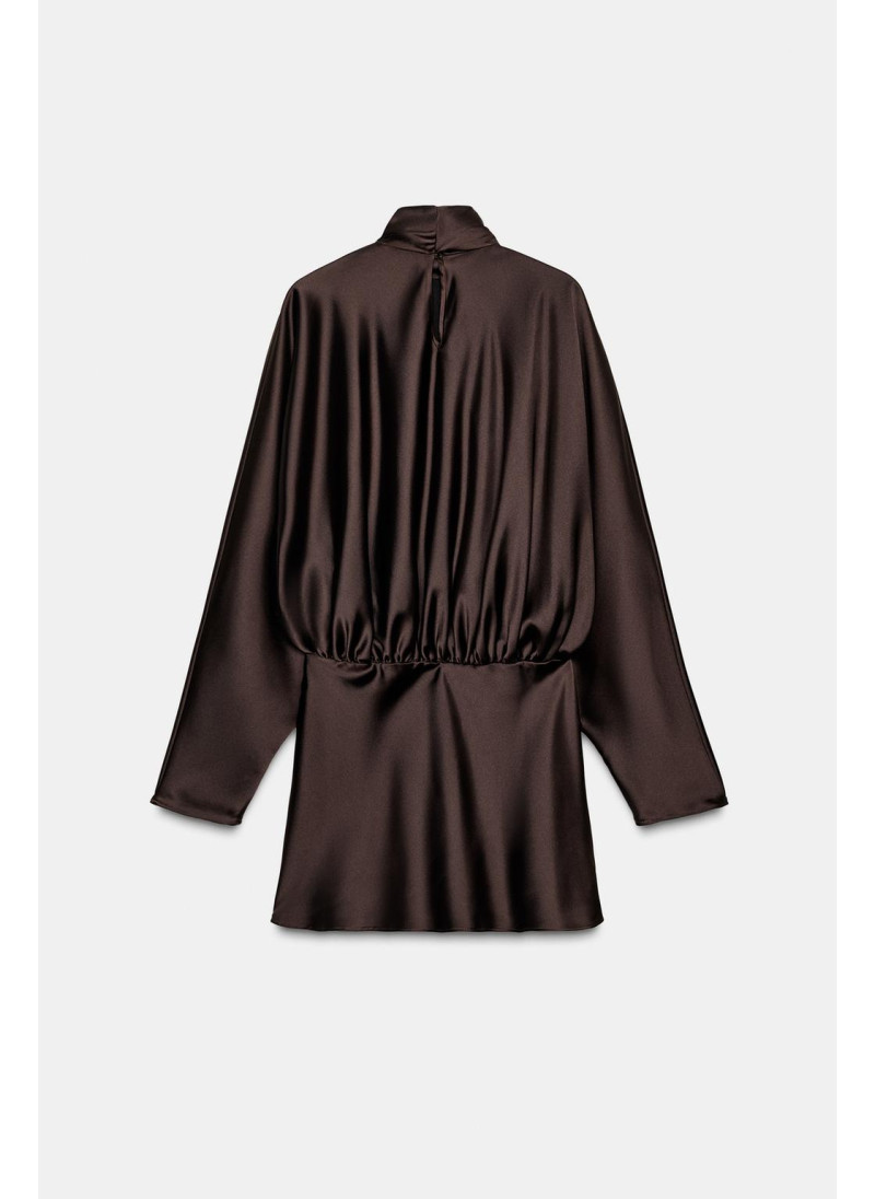 Короткое платье из атласной ткани. Высокий воротник с завязкой-шарфом. Широкие длинные рукава. Деталь со сборками. Боковая застежка на потайную молнию в шве.