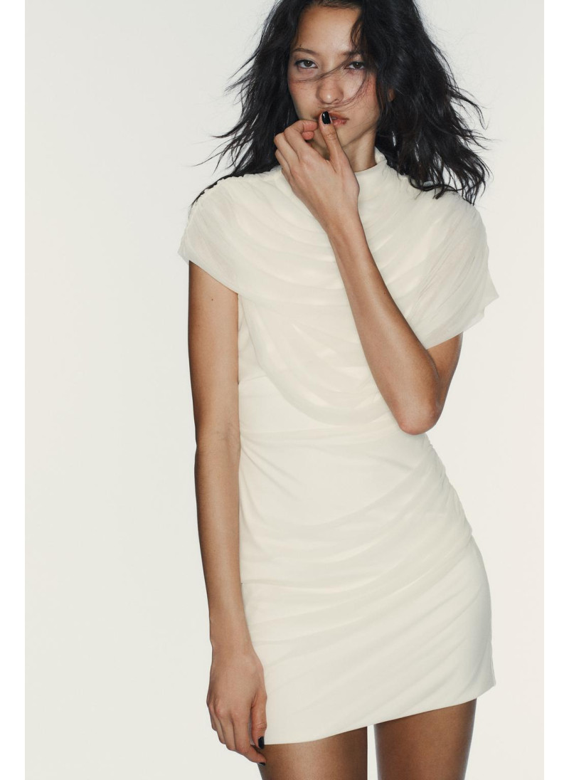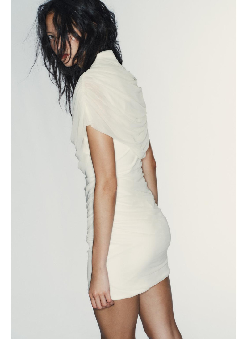 Платье с высоким воротником и безрукавное исполнение. Имеет сопровождающую накидку. Боковой складки. Внутренняя подкладка. Застежка на пуговицу на спине и молния по бокам.