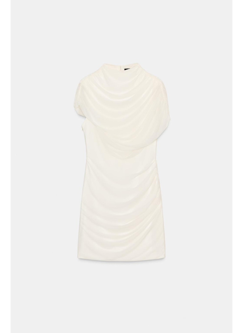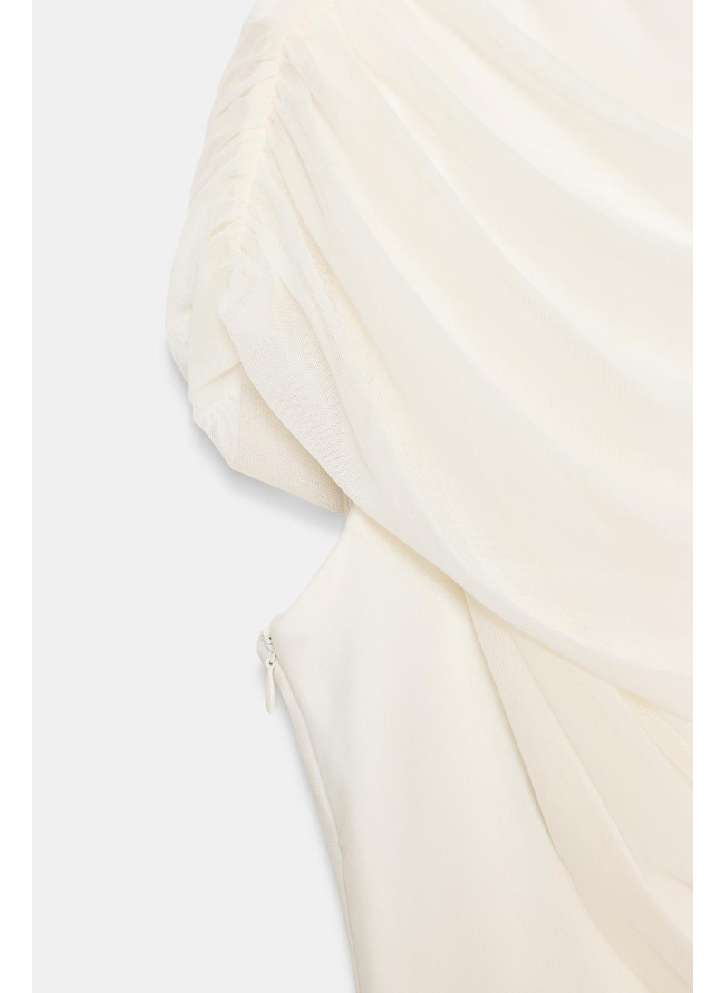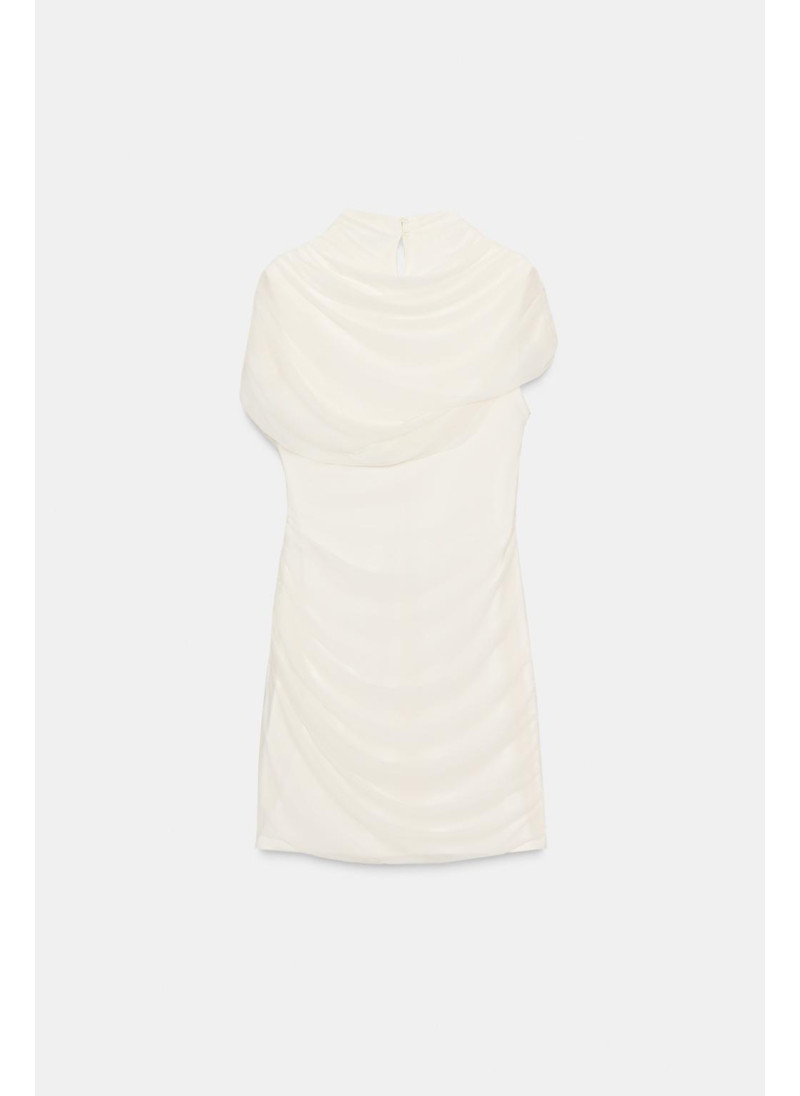 Платье с высоким воротником и безрукавное исполнение. Имеет сопровождающую накидку. Боковой складки. Внутренняя подкладка. Застежка на пуговицу на спине и молния по бокам...