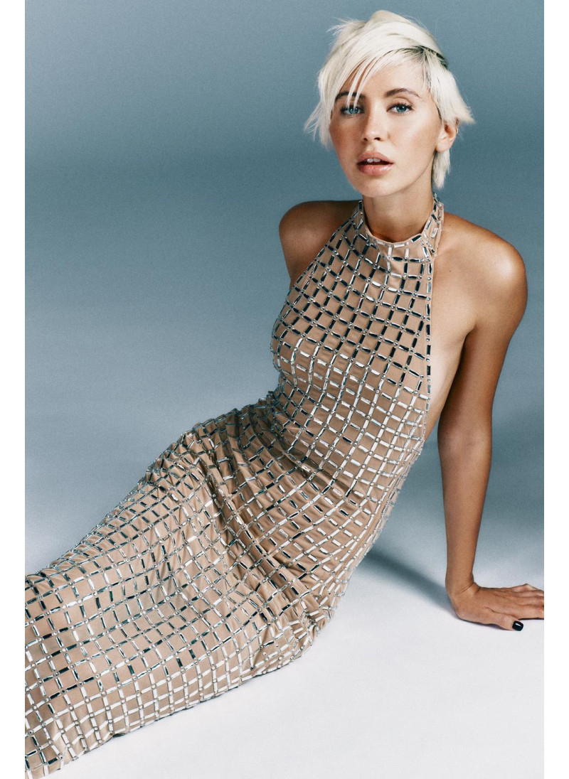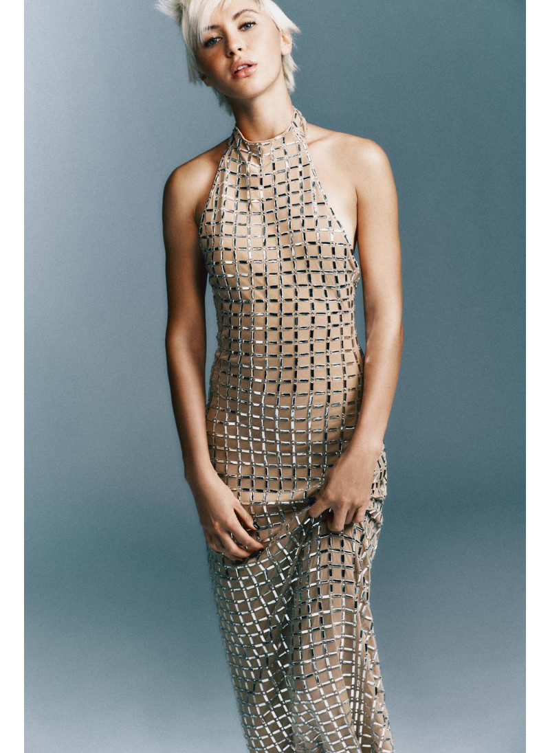 Высота модели: 165 cm | Размер: XS Платье миди из сетчатой ткани. Регулируемый вырез халтер на пуговицах, открытые плечи. Декоративные блестящие вставки контрастного цвета. Застежка-молния на спине, подол с разрезом...