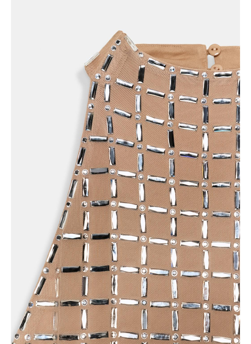 Платье миди из сетчатой ткани. Регулируемый вырез халтер на пуговицах, открытые плечи. Декоративные блестящие вставки контрастного цвета. Застежка-молния на спине, подол с разрезом.