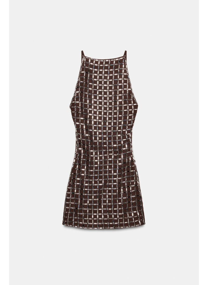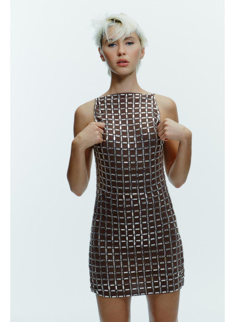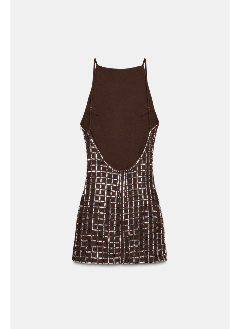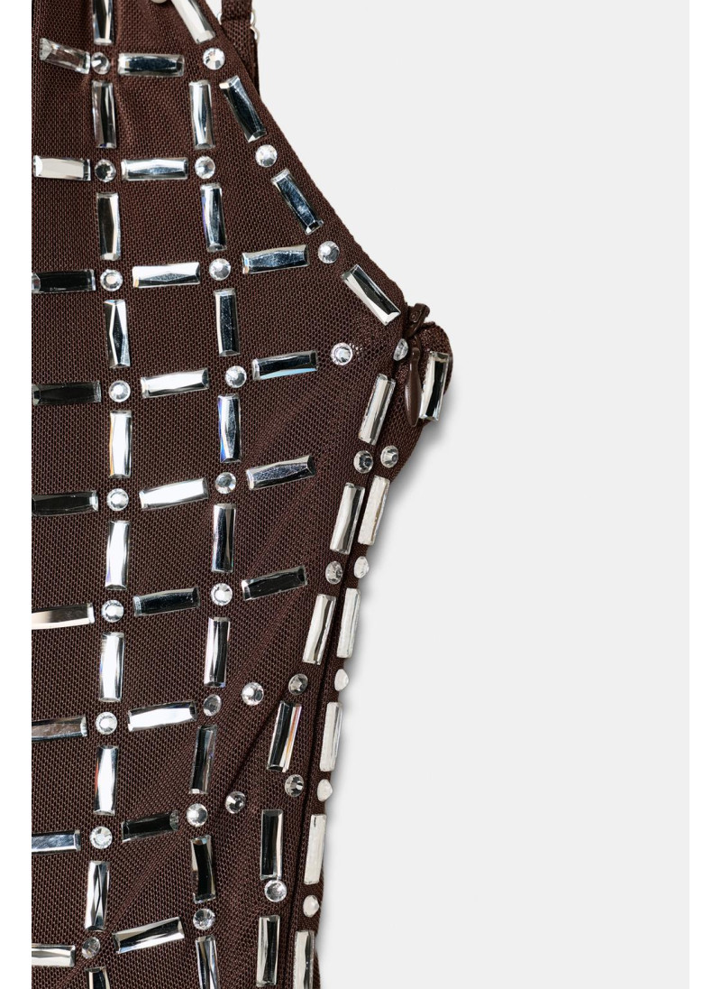 Короткое платье изготовлено из сетчатой ткани. Имеет прямую линию горловины и тонкие бретельки. Контрастный блестящий аппликация. Скрытая молния по боковому шву...