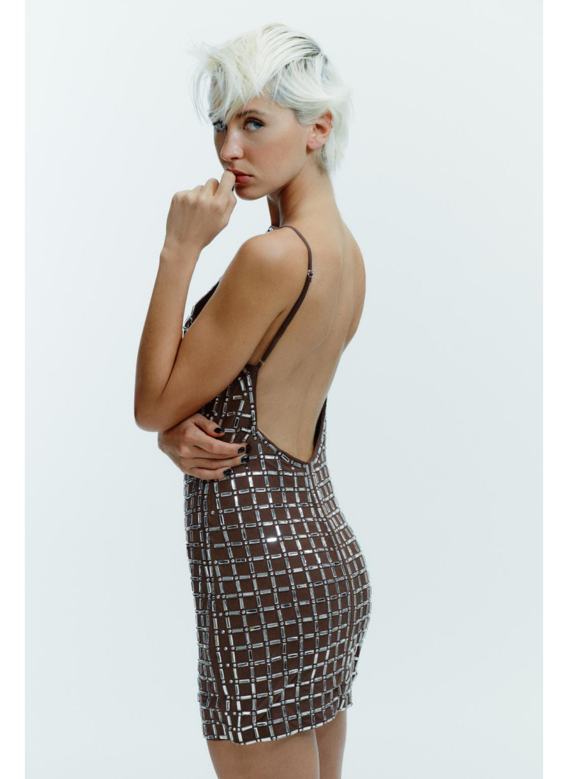 Короткое платье изготовлено из сетчатой ткани. Имеет прямую линию горловины и тонкие бретельки. Контрастный блестящий аппликация. Скрытая молния по боковому шву.