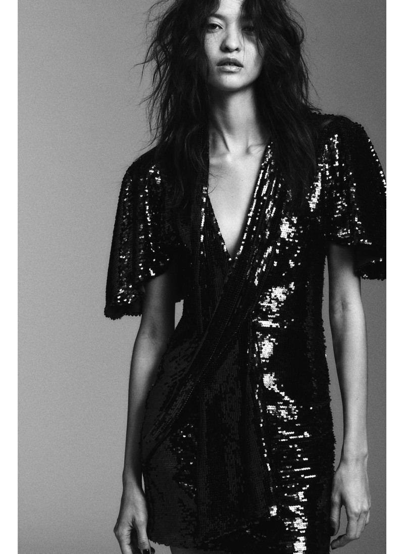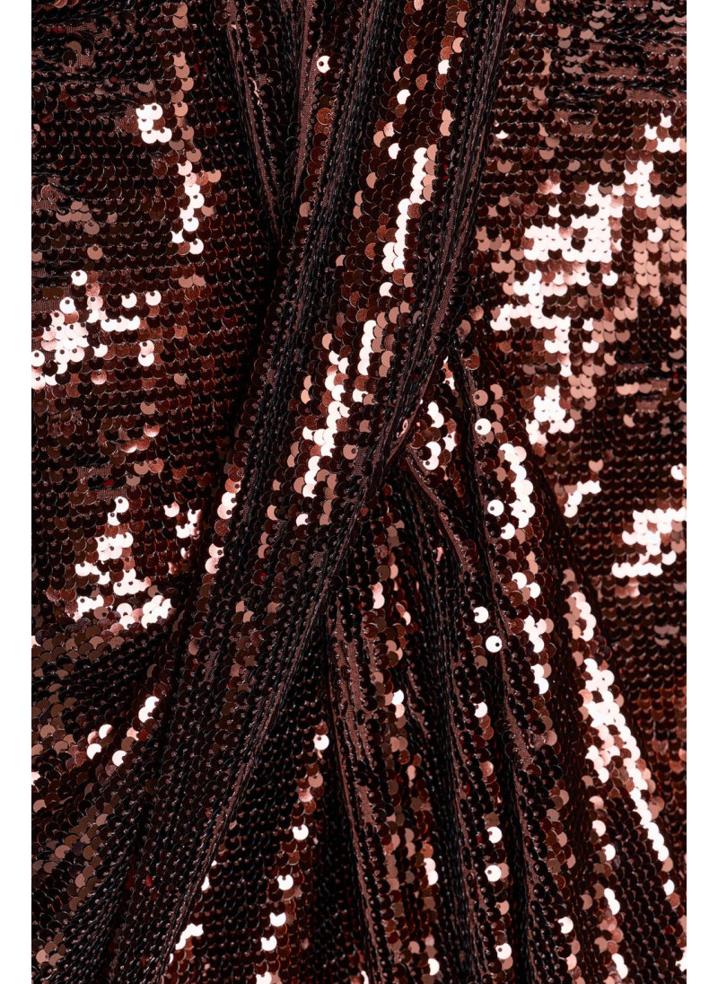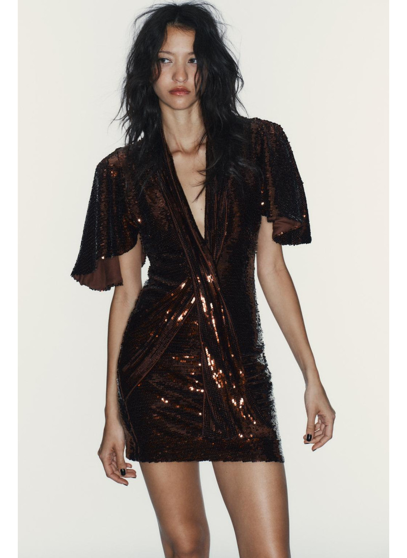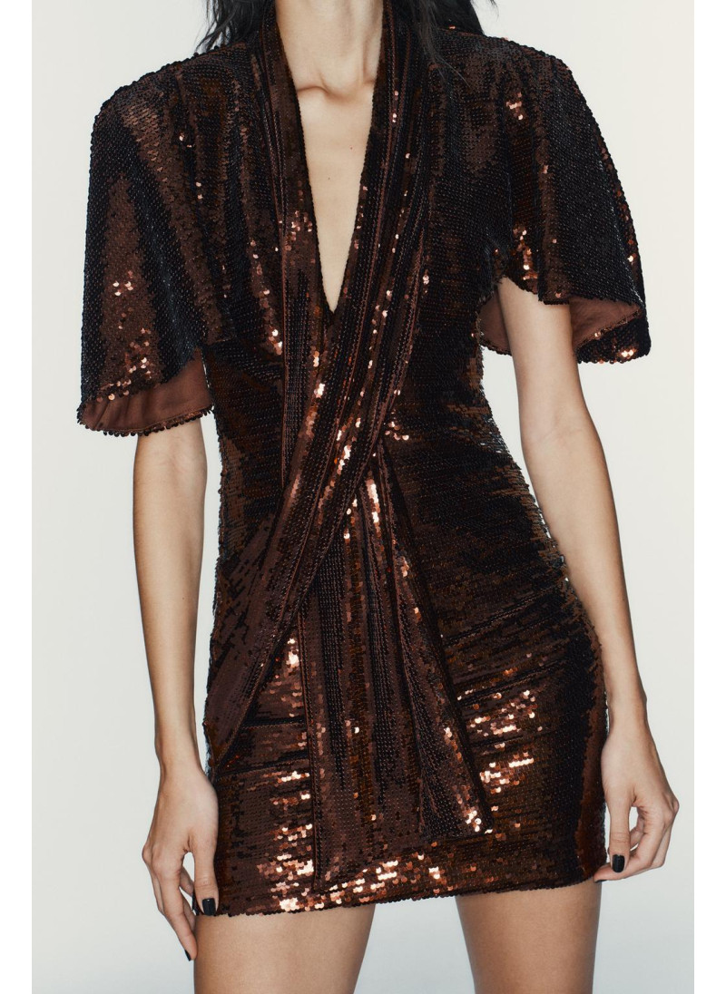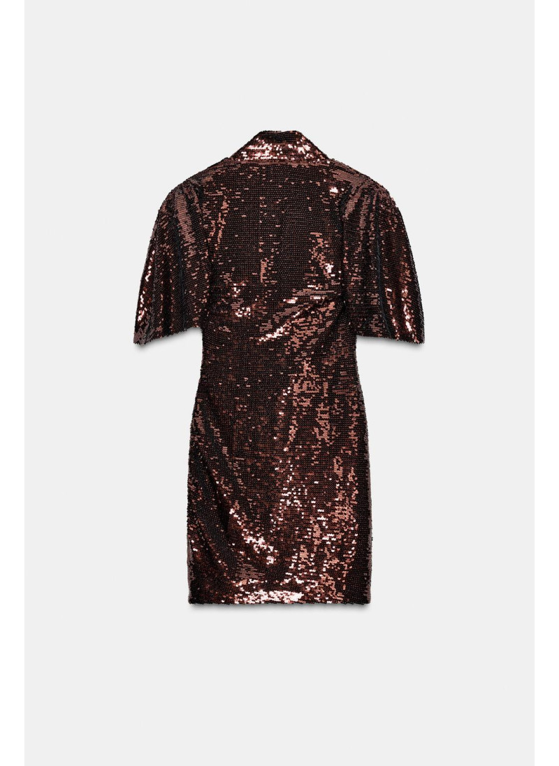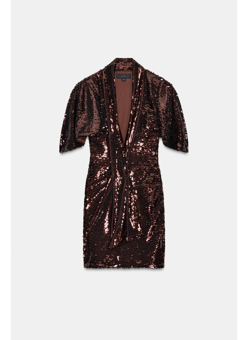 Короткое платье с v-образным вырезом и короткими рукавами. Украшено аппликациями из пайеток и подходящим шарф-стилем ткани. Со внутренней подкладкой.