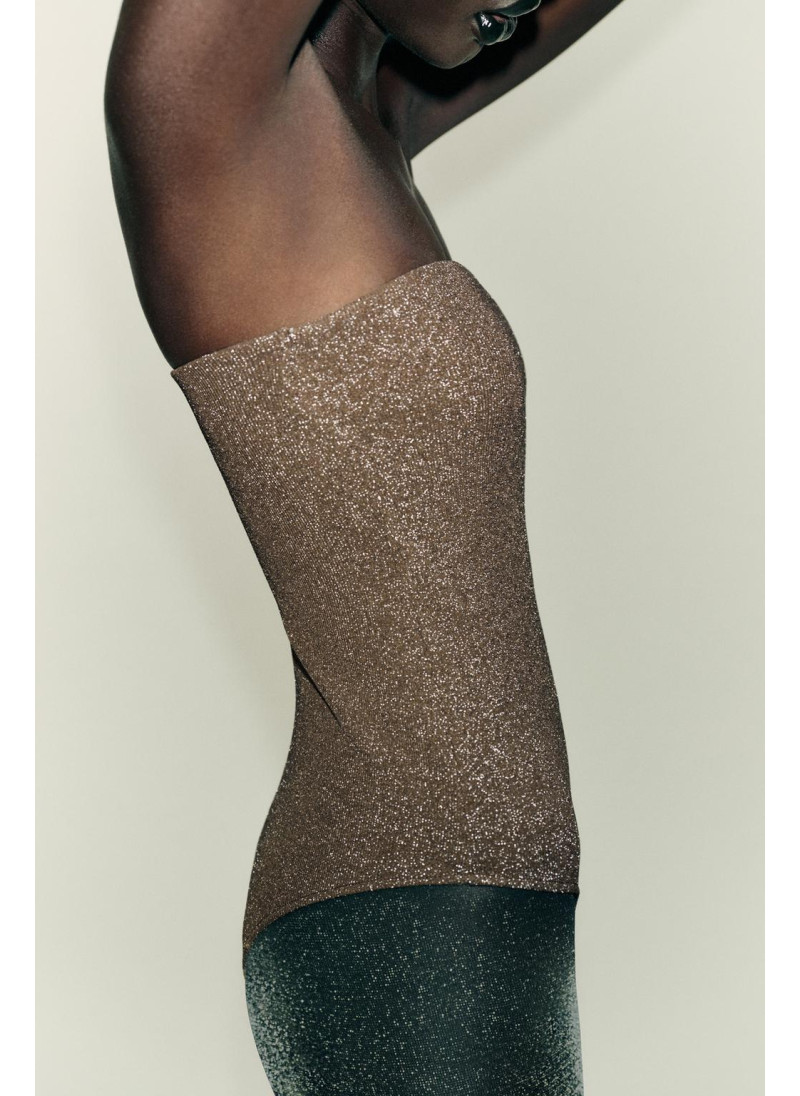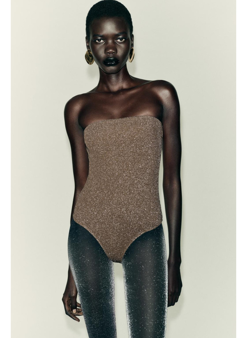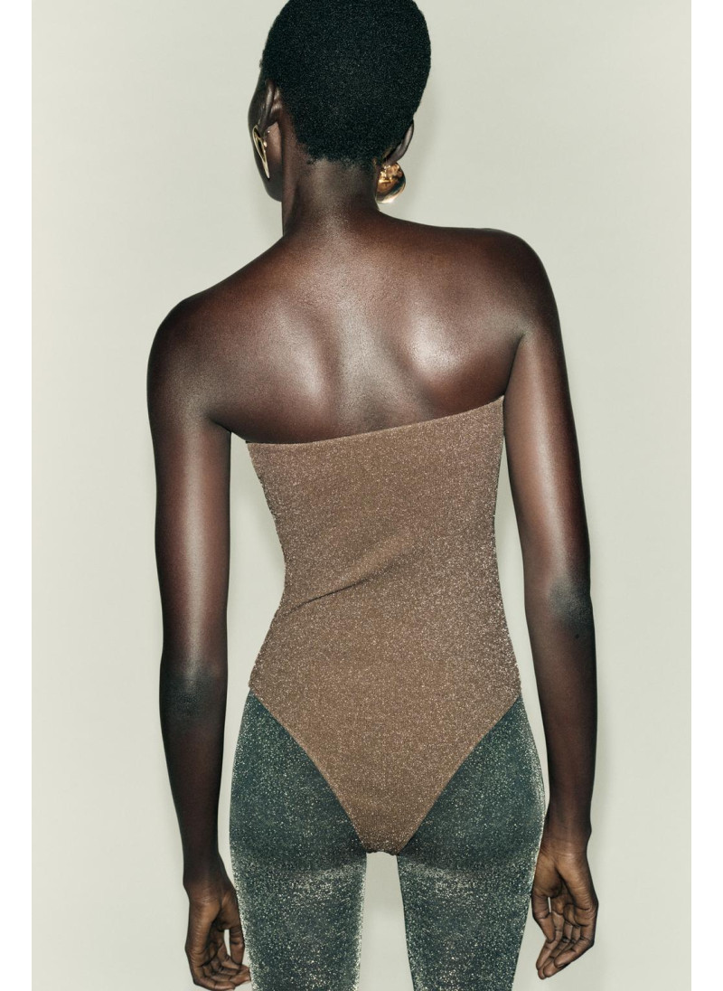 Высота модели: 178 cm | Размер: S Боди бандо с открытыми плечами. Деталь с металлизированной нитью. Застежка на пуговицы снизу...