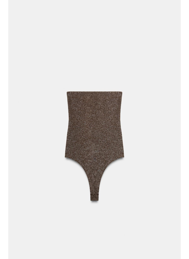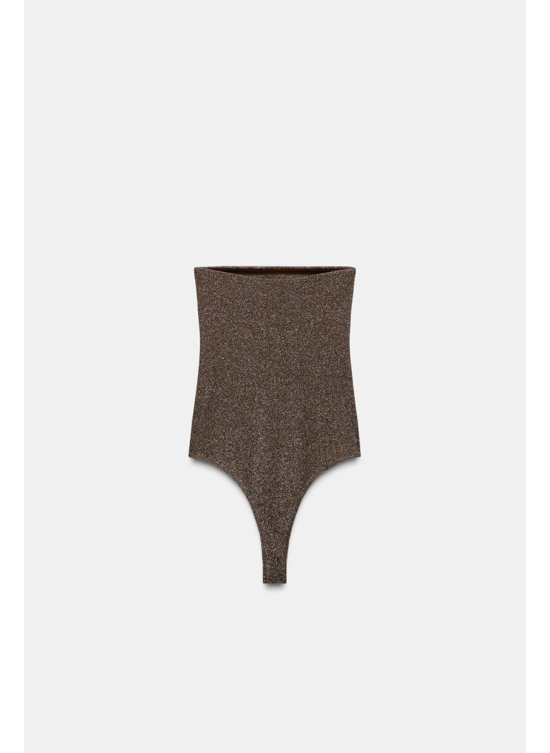 Боди бандо с открытыми плечами. Деталь с металлизированной нитью. Застежка на пуговицы снизу.