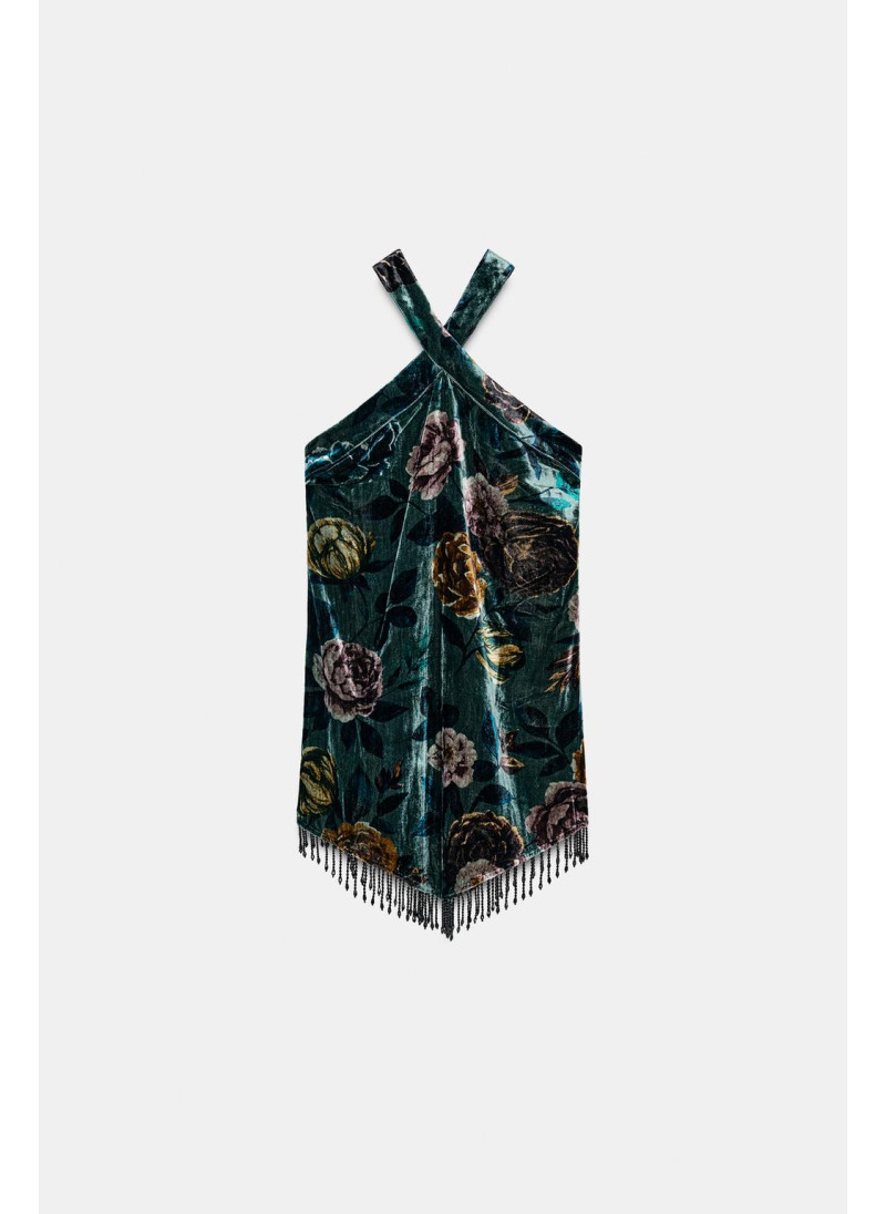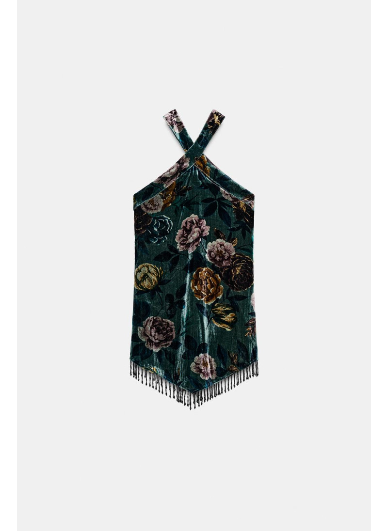 Короткое платье из бархата с галстуком на шее и открытыми плечами. Нижний край завершен бисерной бахромой...