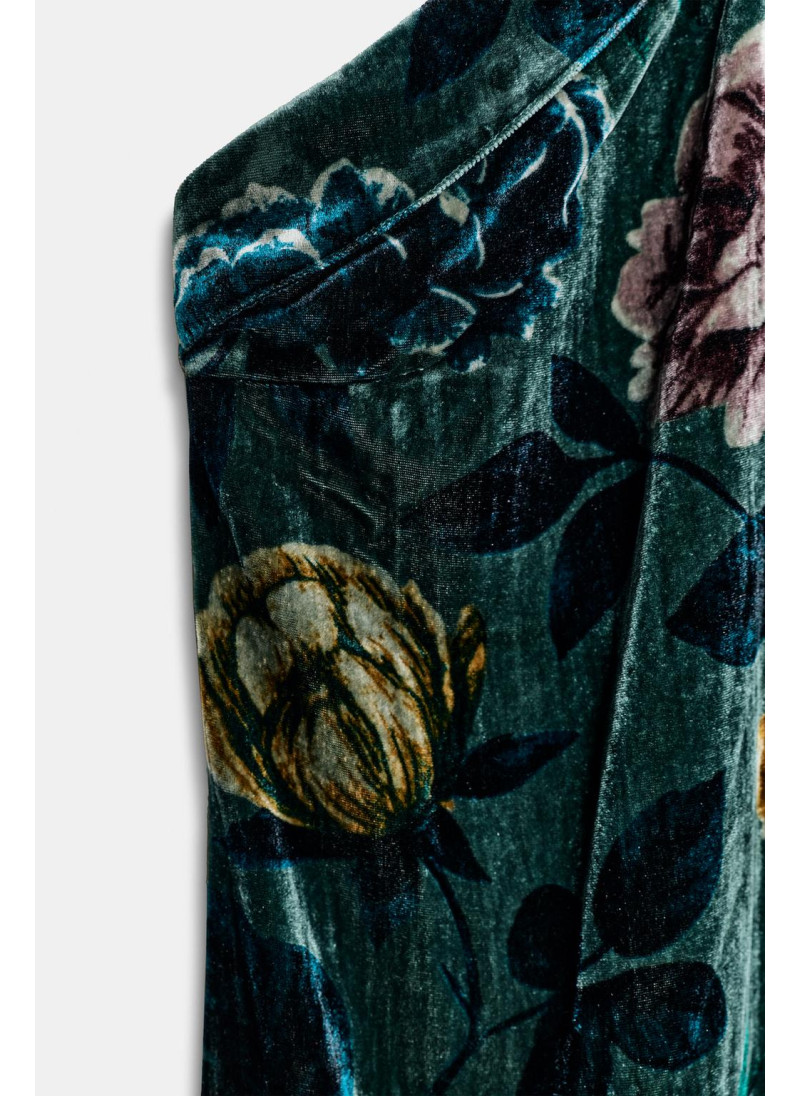 Короткое платье из бархата с галстуком на шее и открытыми плечами. Нижний край завершен бисерной бахромой.
