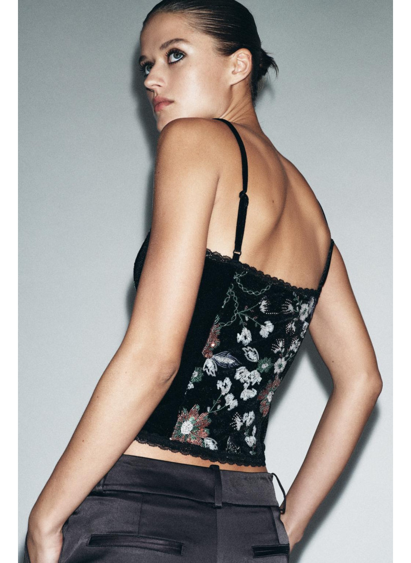 Корсет изготовлен из бархатной ткани. Имеет регулируемые тонкие бретели, детали с вышивкой и пайетками, и застежку на завязках спереди.