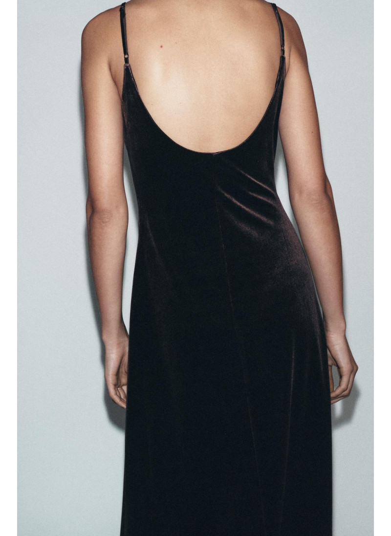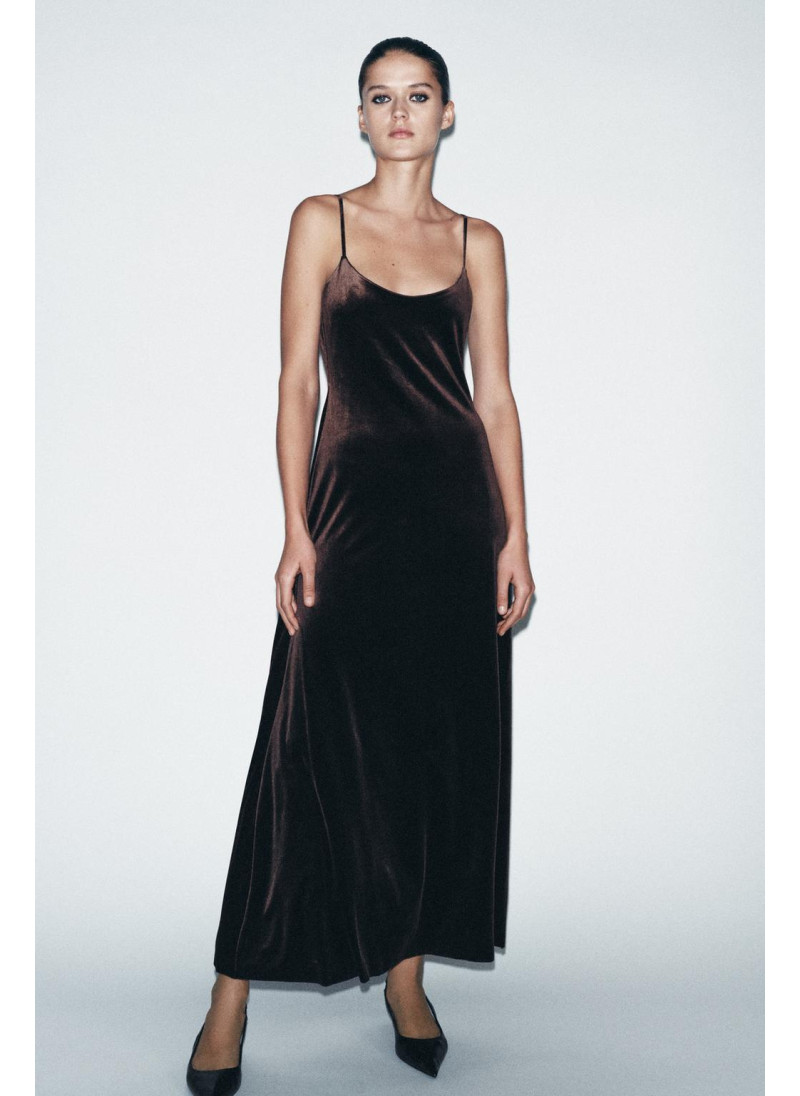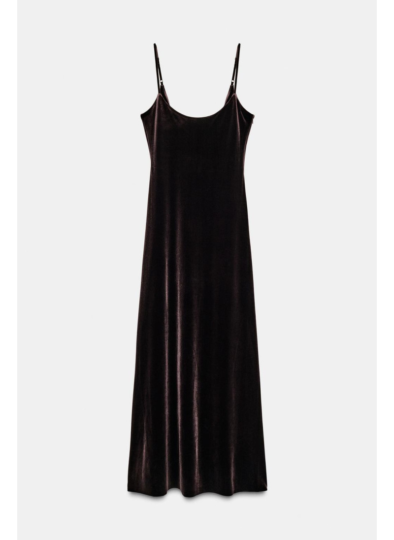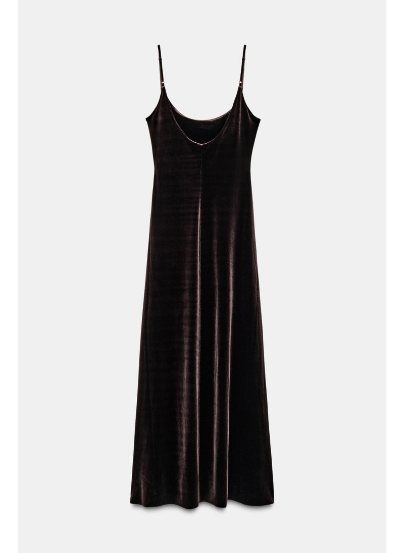 Длинное бархатное платье. Круглый вырез, тонкие регулируемые бретели. Низ расклешенного кроя.