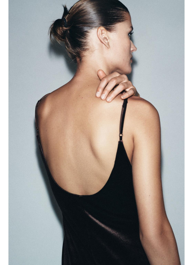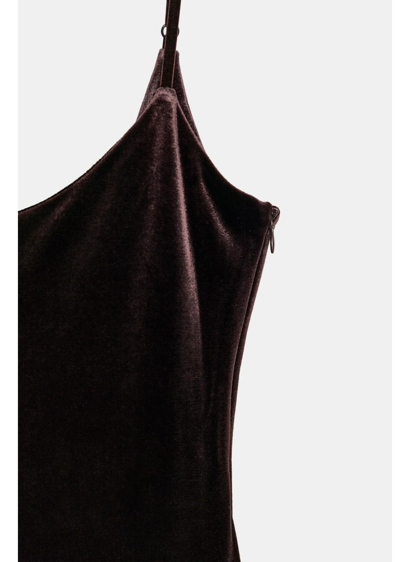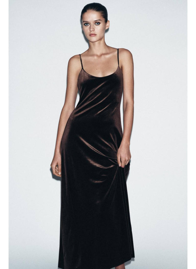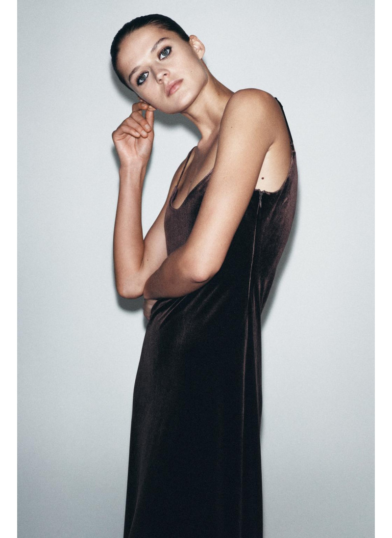 Длинное бархатное платье. Круглый вырез, тонкие регулируемые бретели. Низ расклешенного кроя.