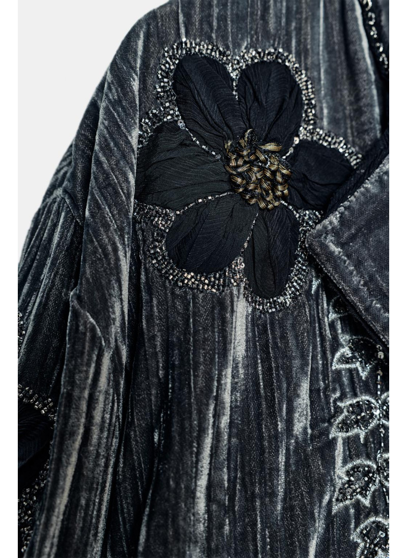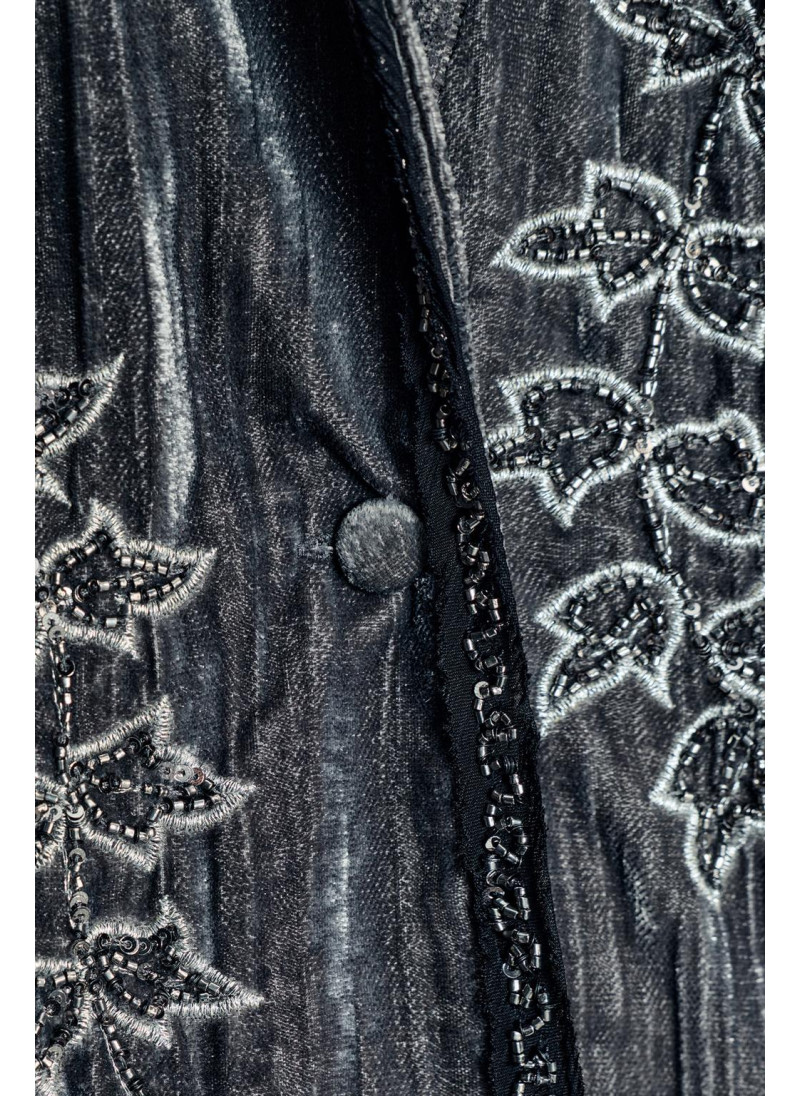 Кино из бархатной ткани. Круглый вырез и длинные рукава. Вышивка металлизированной нитью. Передние карманы. Застежка спереди.