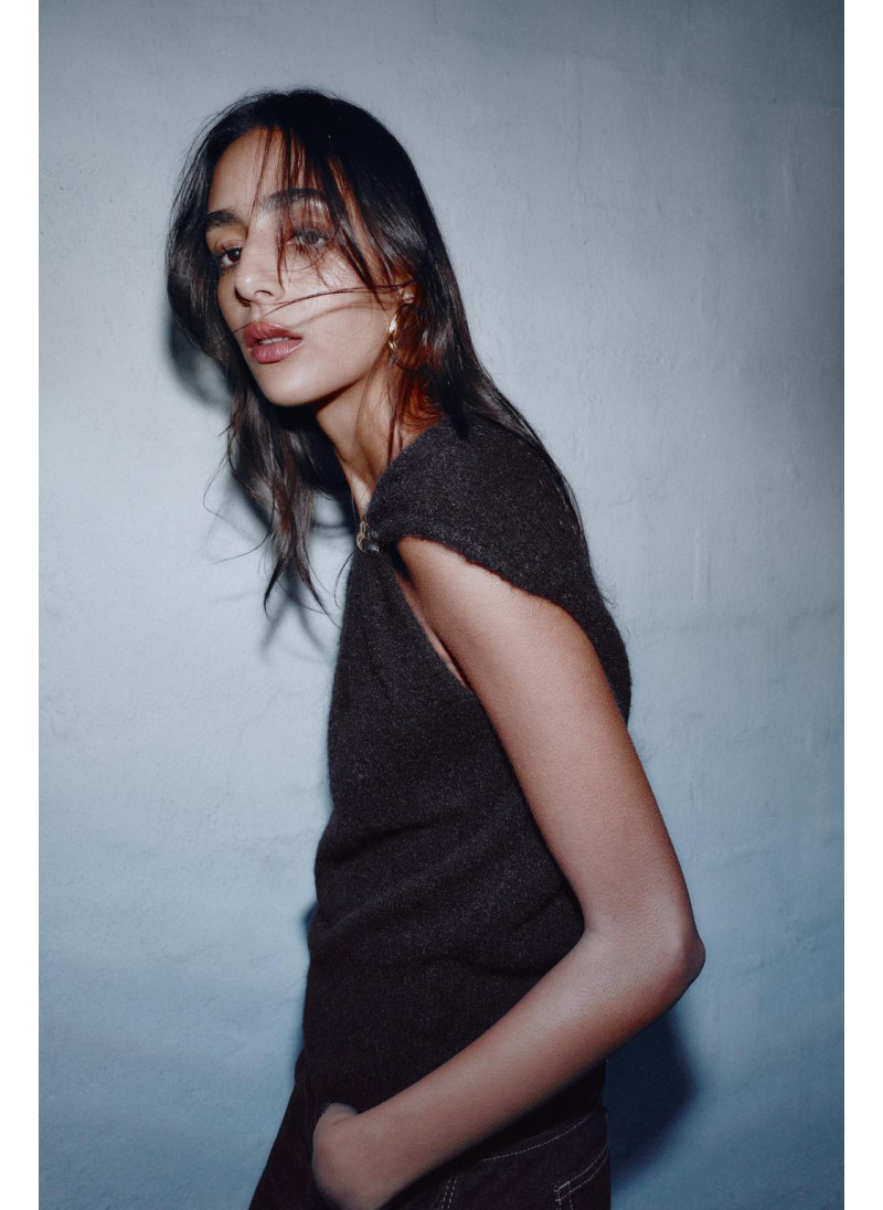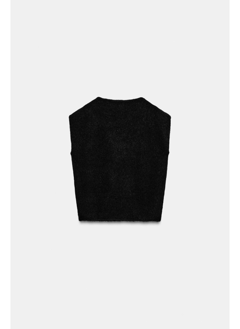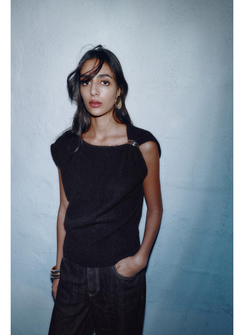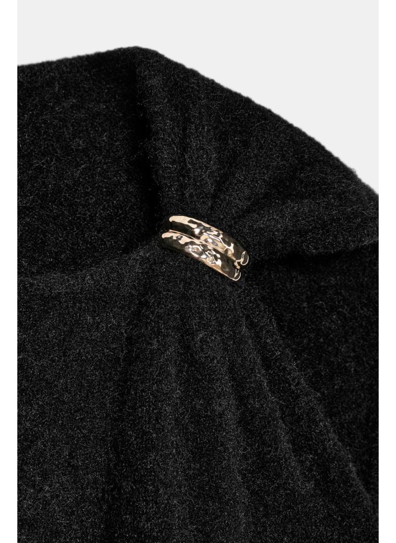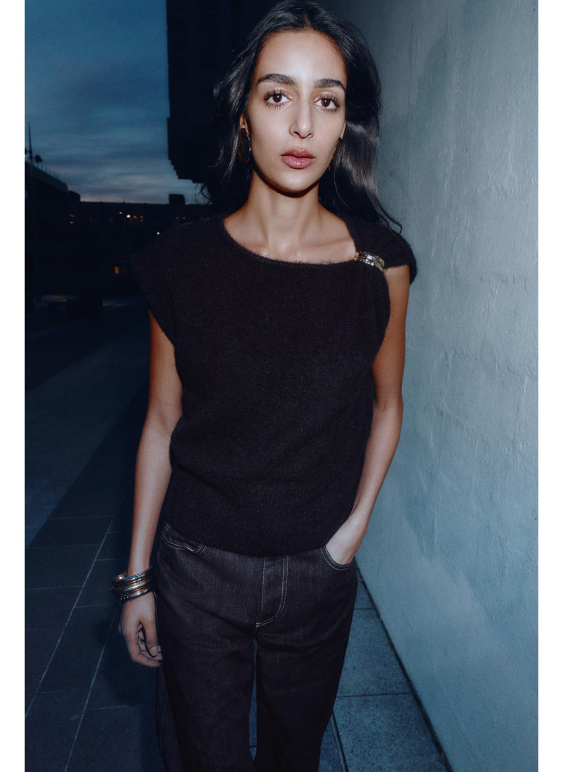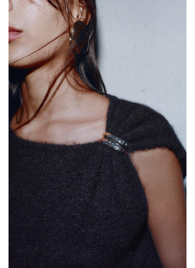 Однотонный трикотажный свитер с драпированным вырезом горловины, украшенный золотистой брошью и дизайном без рукавов.