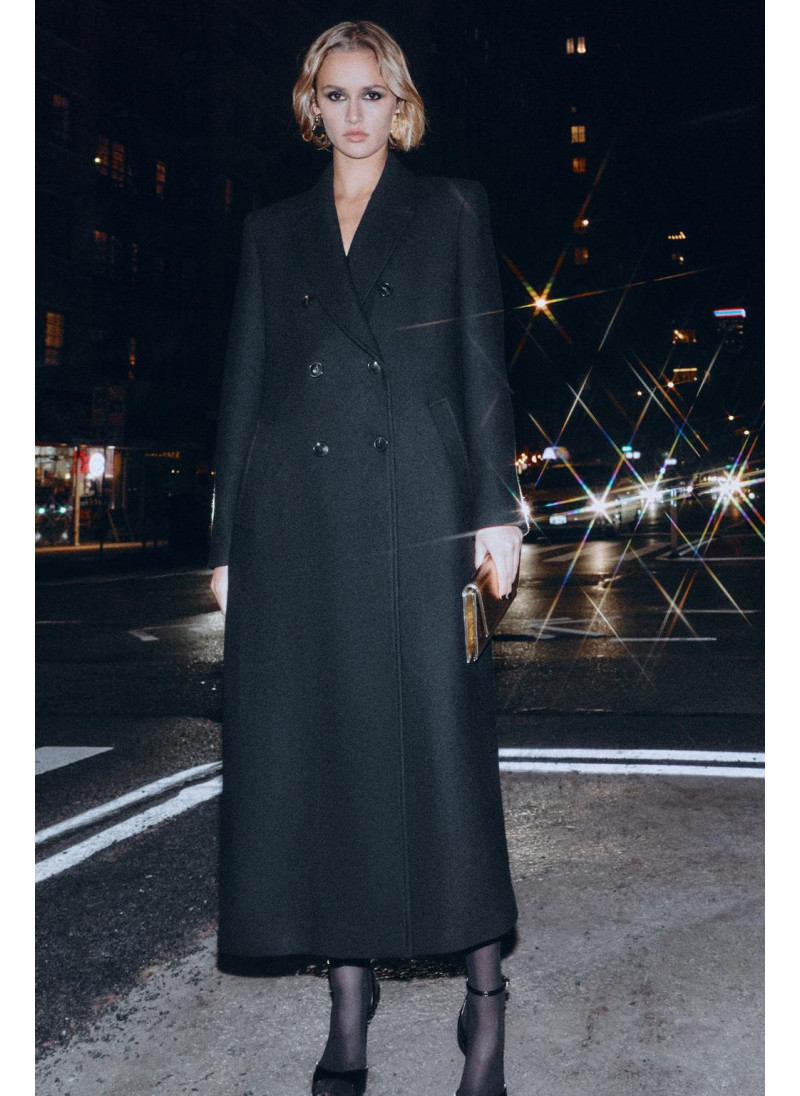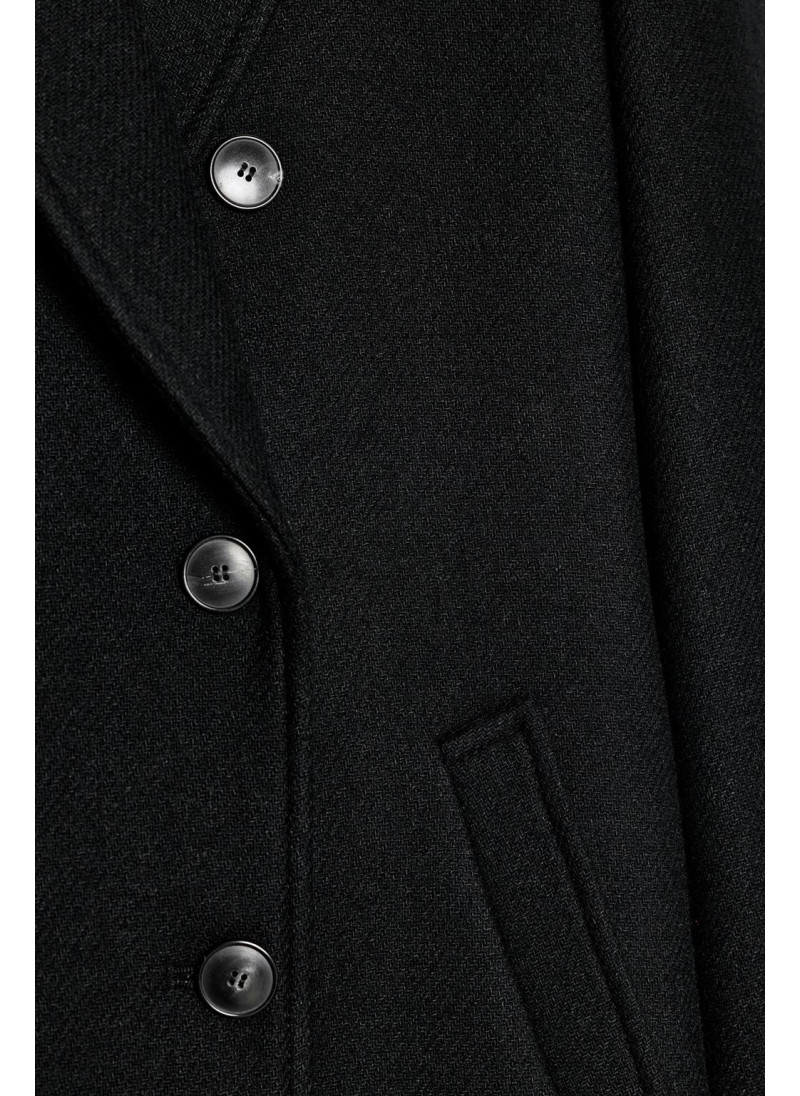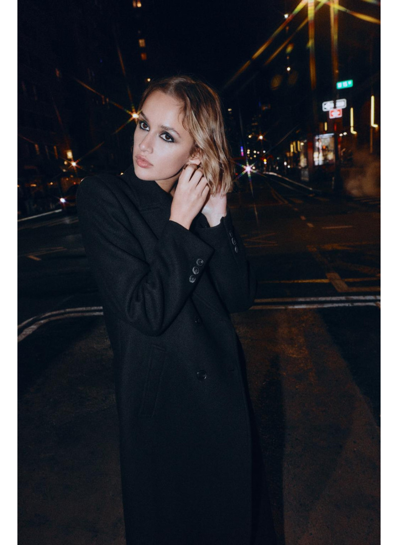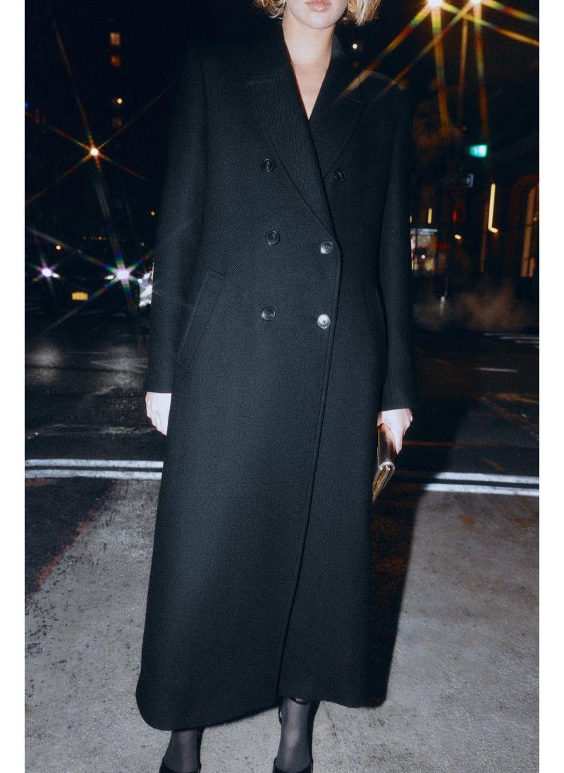 Пальто из шерсти. Имеет отложной воротник и длинные рукава с подкладками. Передние карманы в шве. Задний разрез у подола. Застежка на две пуговицы спереди.