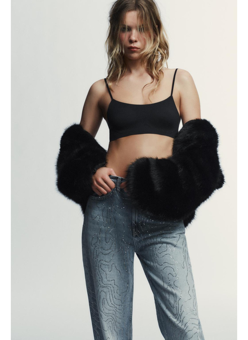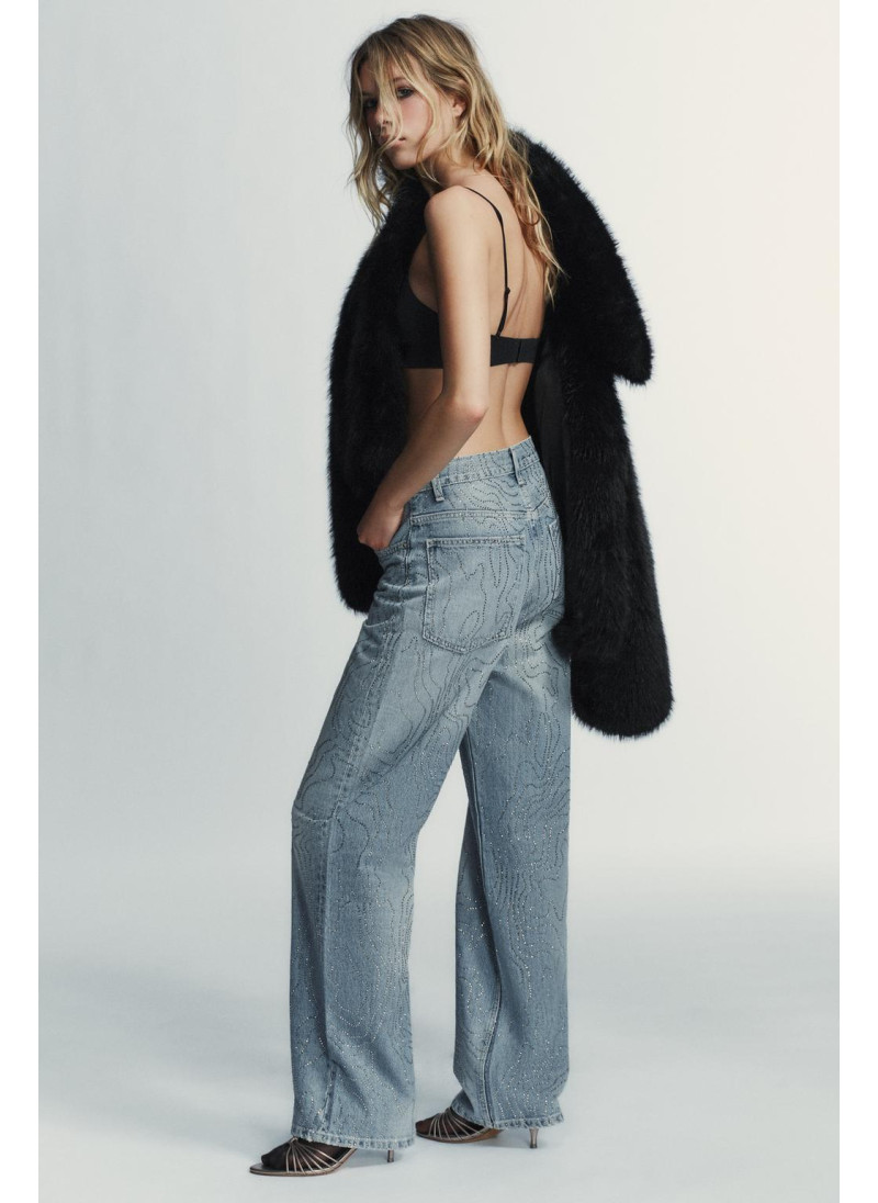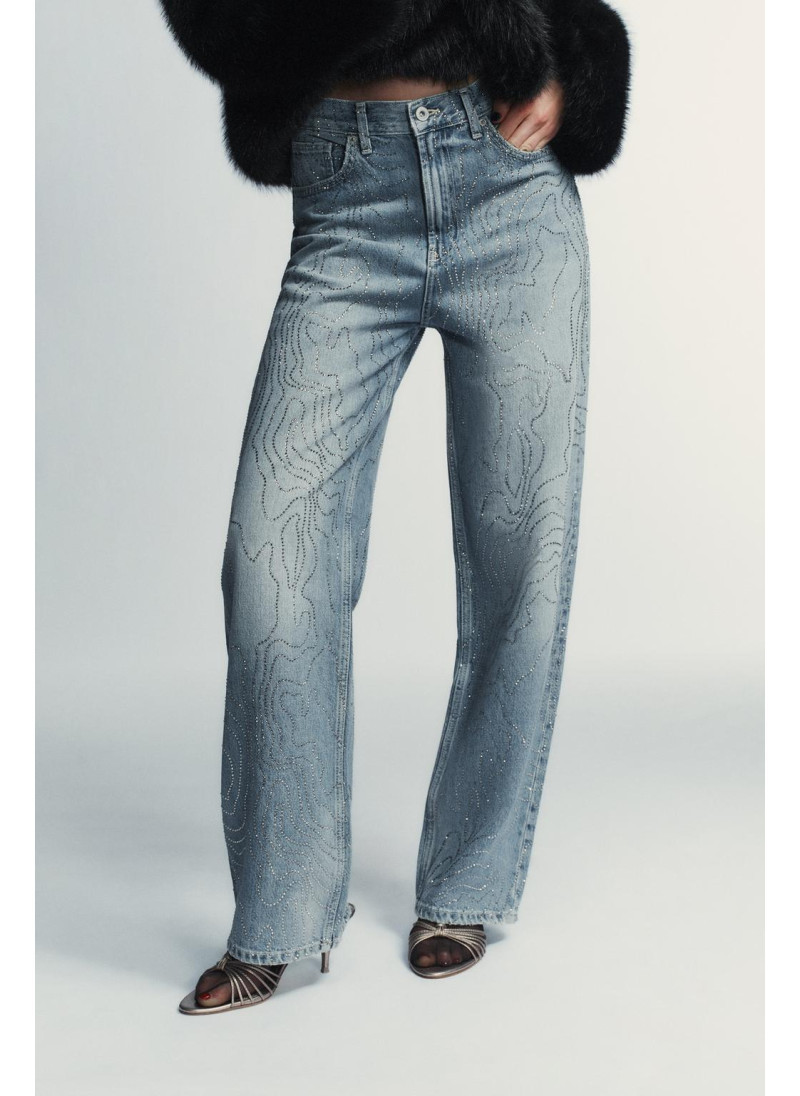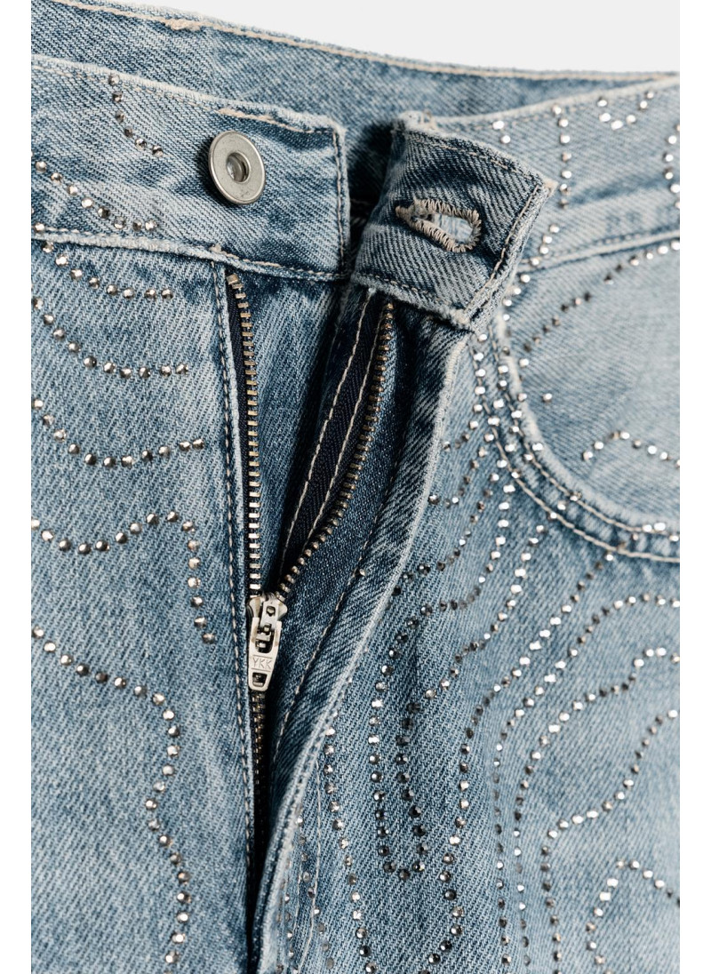 ВЫСОКАЯ ПОСАДКА - ПРЯМОЙ КРОЙ Джинсы с высокой посадкой и пятью карманами. Отделка из контрастных комбинированных стразов. Прямые штанины. Застежка-молния и металлическая пуговица спереди...