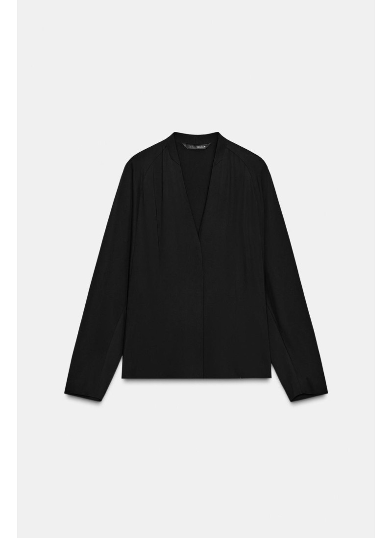 Блуза силуэта "фиттед" из вискозного микса. V-образный вырез и длинный рукав. Детали складок по бокам. Прямая нижняя кромка.