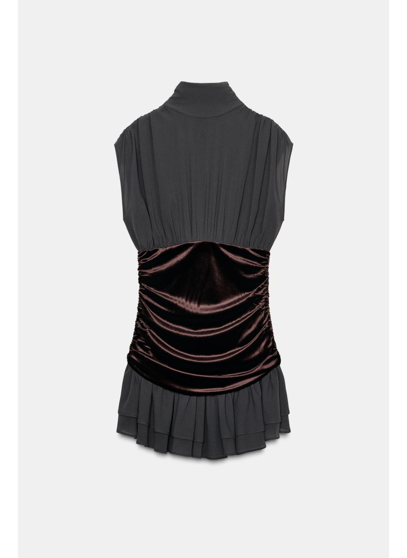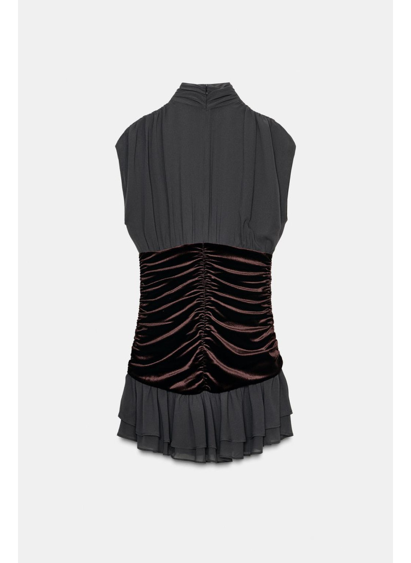 Высота модели: 176 cm | Размер: S Короткое платье с воротником-стойкой и рукавами без манжет с драпировкой на плече. Контрастные бархатные вставки. Подол с воланами в тон. Потайная молния сзади...