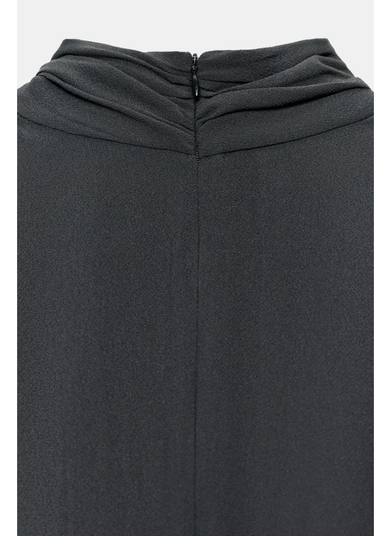 Короткое платье с воротником-стойкой и рукавами без манжет с драпировкой на плече. Контрастные бархатные вставки. Подол с воланами в тон. Потайная молния сзади.