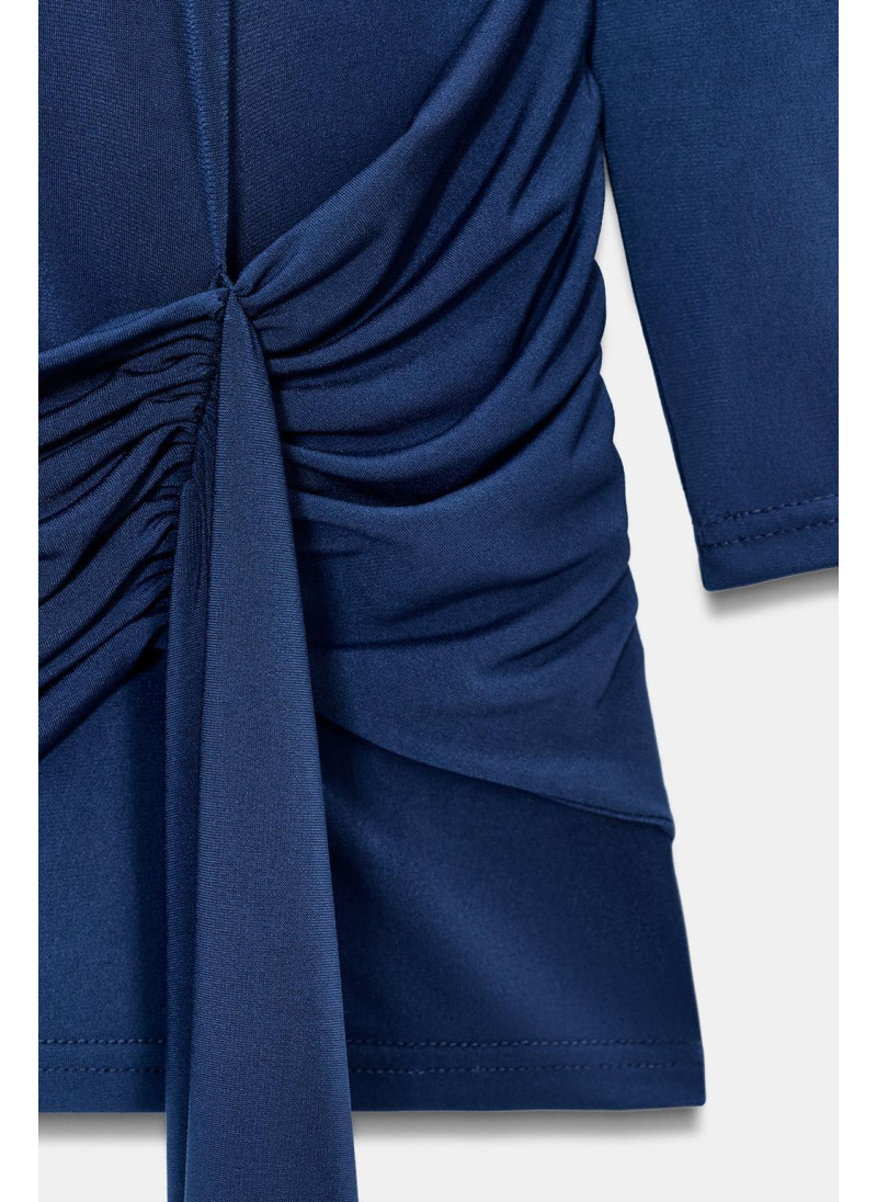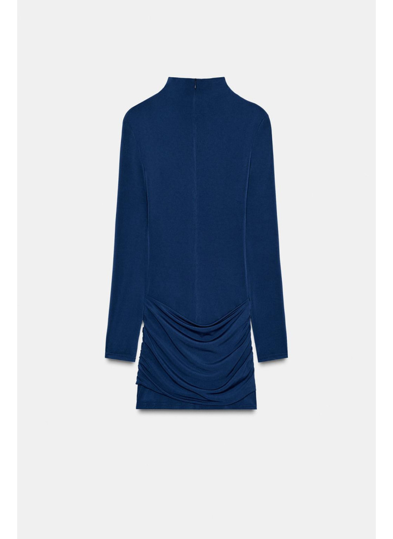Короткое платье с высоким воротником и длинным рукавом. Аппликация тонкого пояса на пояснице. Застёжка-молния на спине...