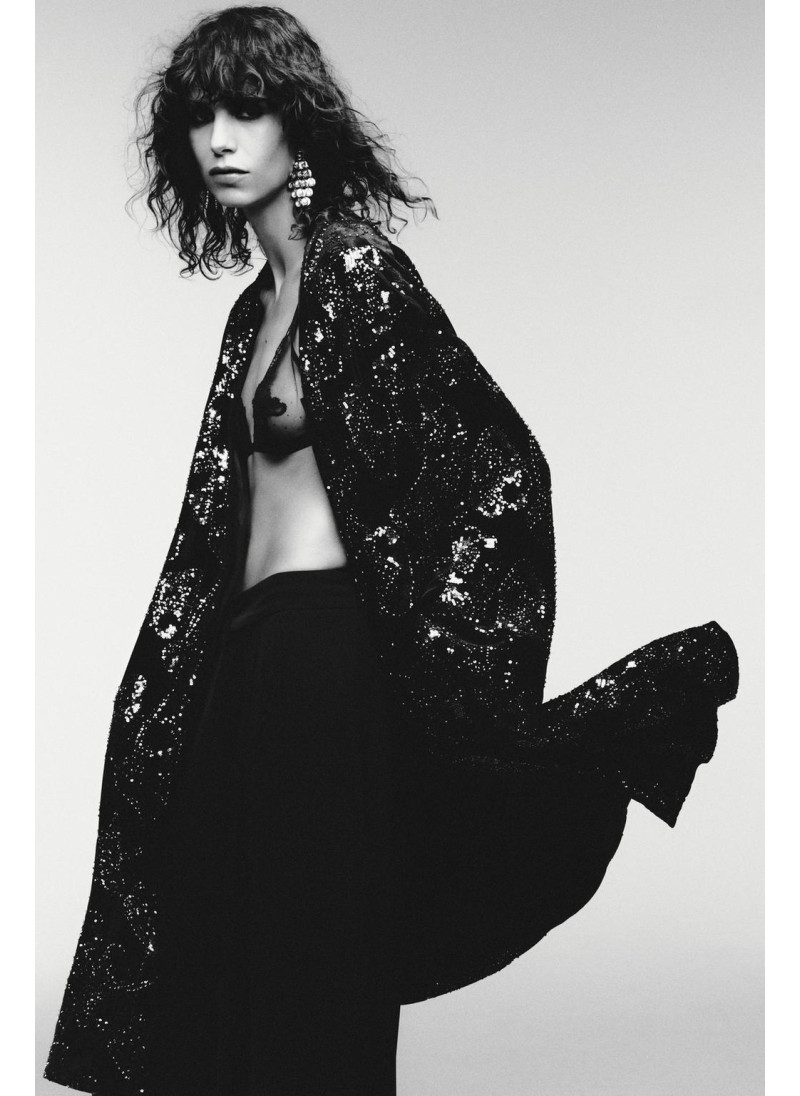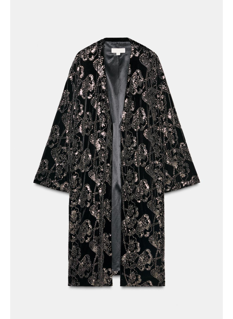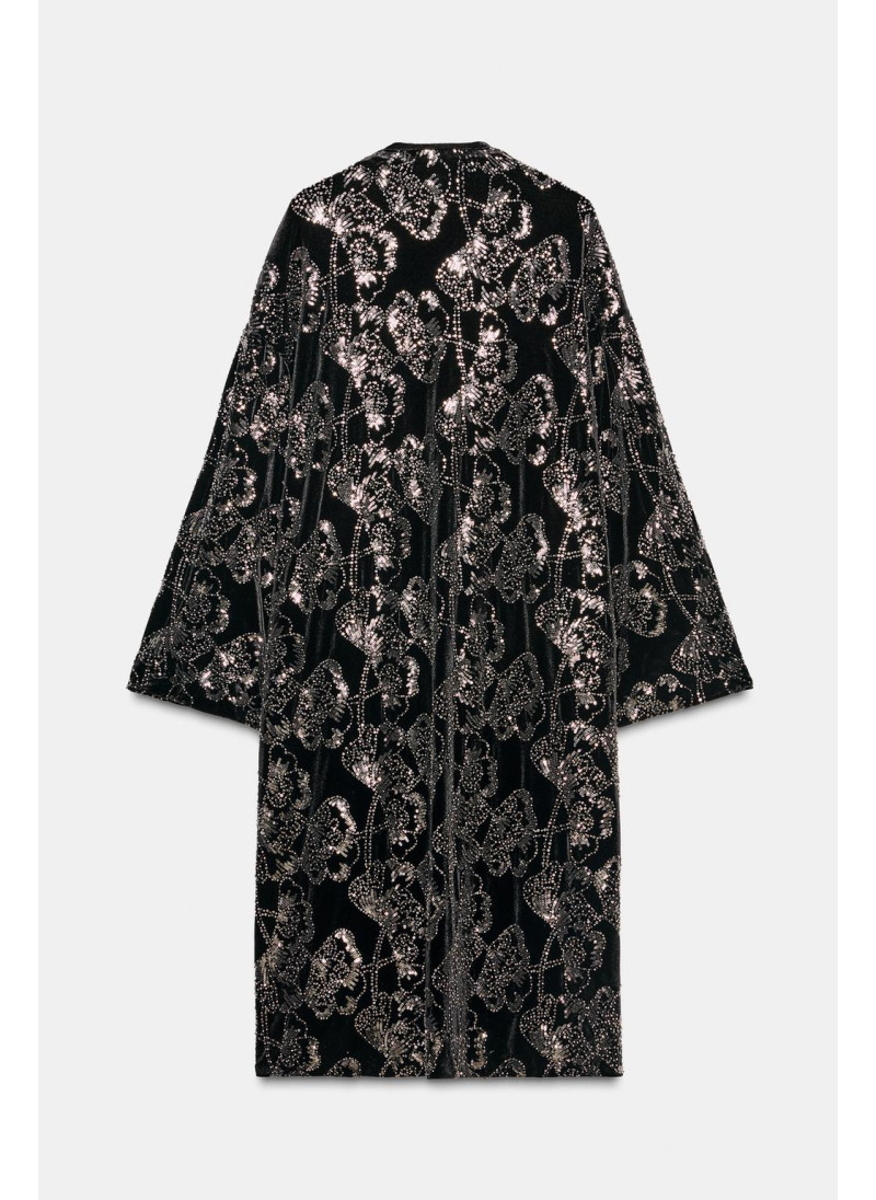 Длинное открытое пальто из бархата. Длинные рукава, потайные боковые карманы в швах. Отделка из бисера и пайеток. Подол с разрезами.