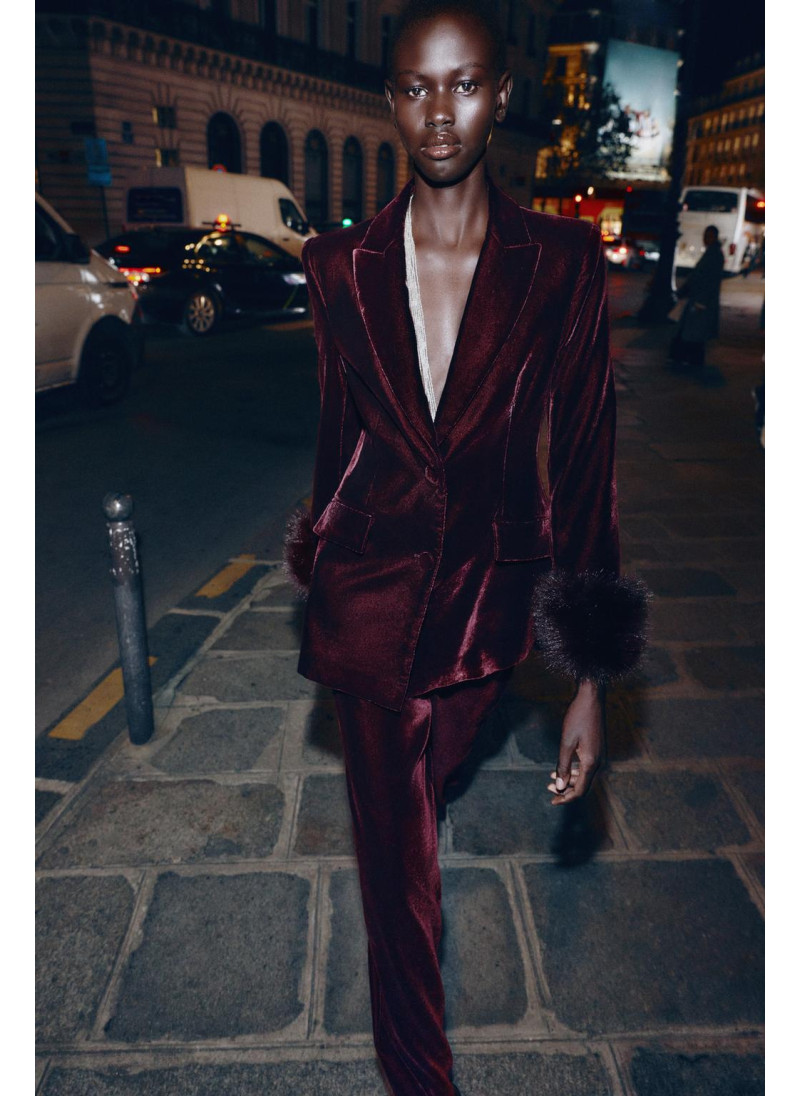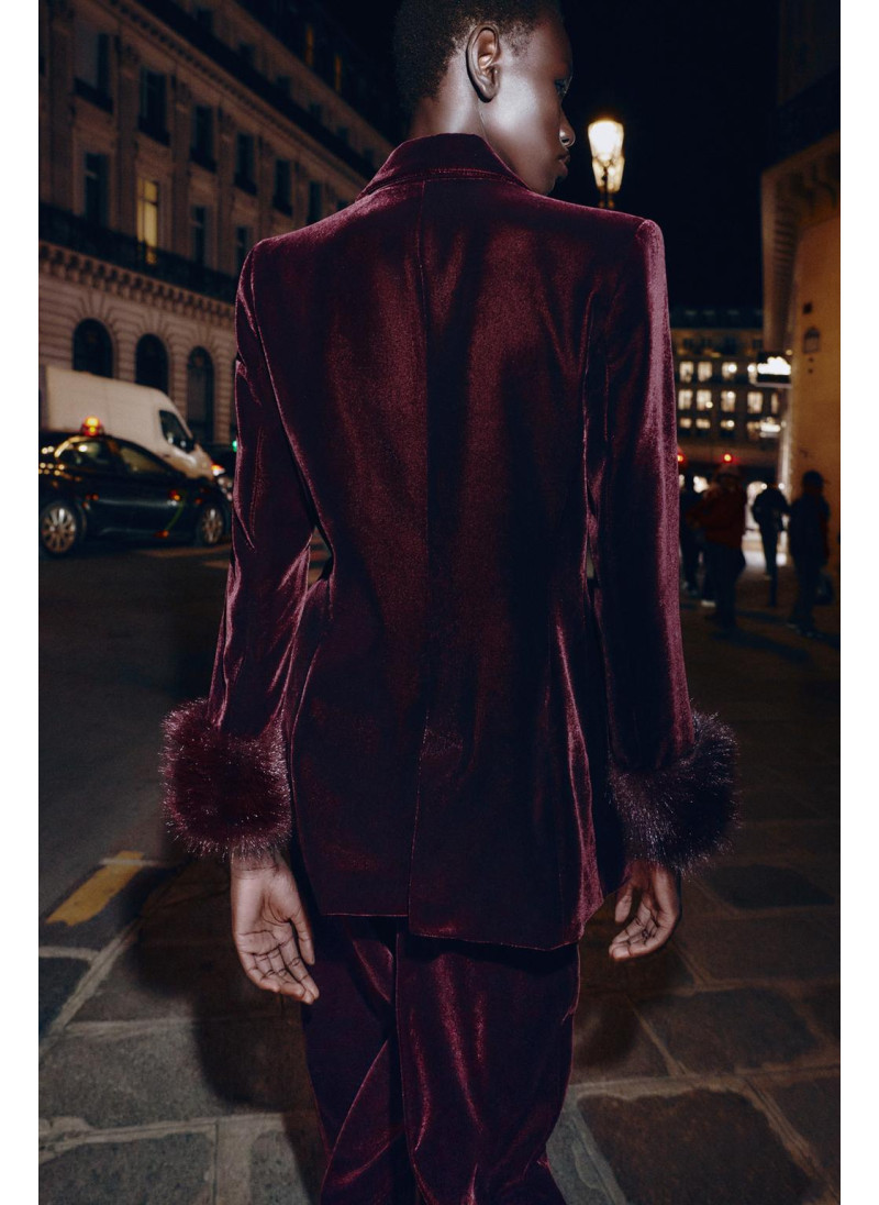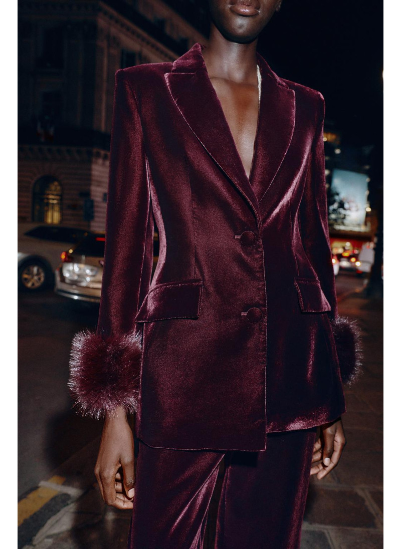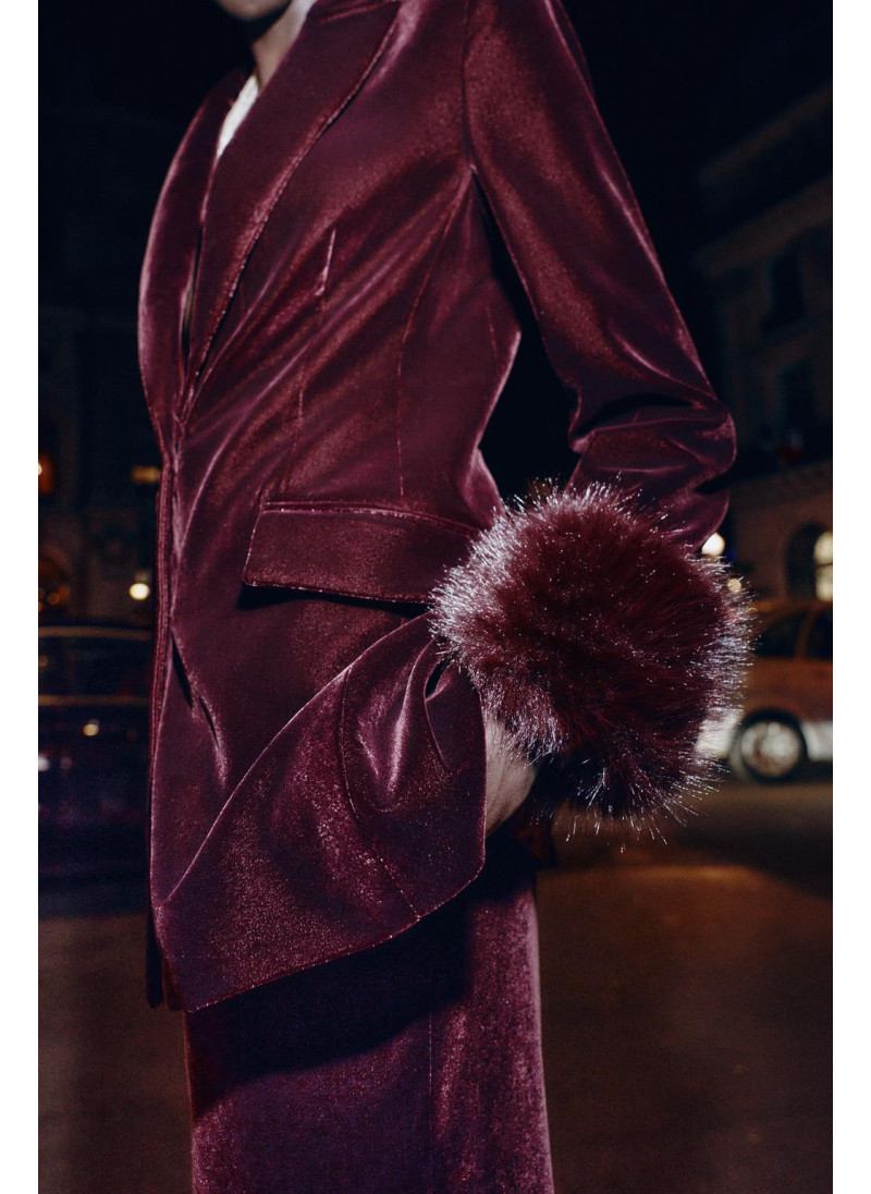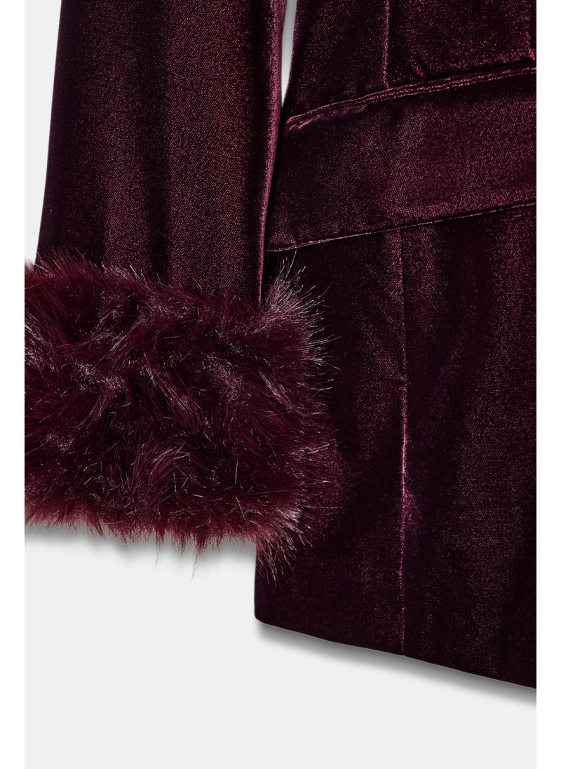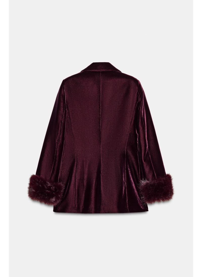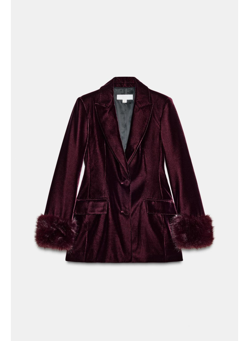 Облегающий блейзер с лацканом и длинными рукавами с наполнителями на плечах, завершенный манжетами из искусственного меха. Карманы с клапанами спереди. Задний разрез. Застежка спереди на обтянутые пуговицы.