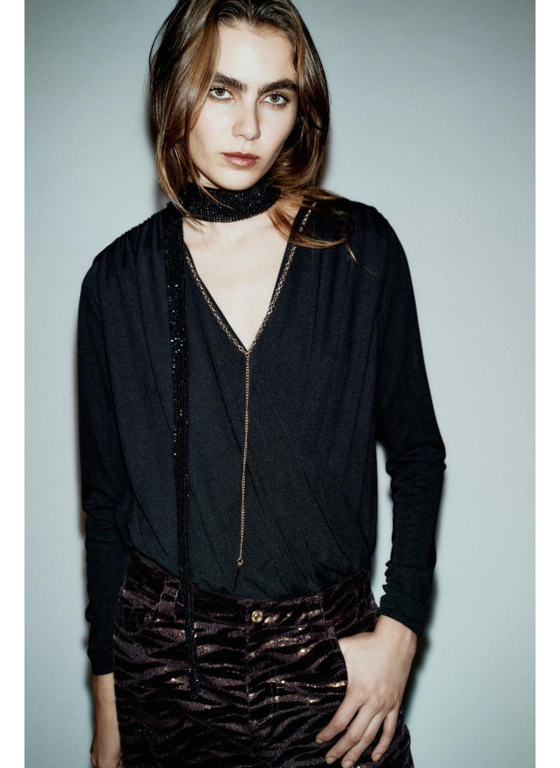 Высота модели: 178 cm | Размер: M Брюки с высокой посадкой и пятью карманами. Комбинированная ткань: бархат и пайетки. Прямые длинные штанины. Застежка-молния и пуговица спереди...
