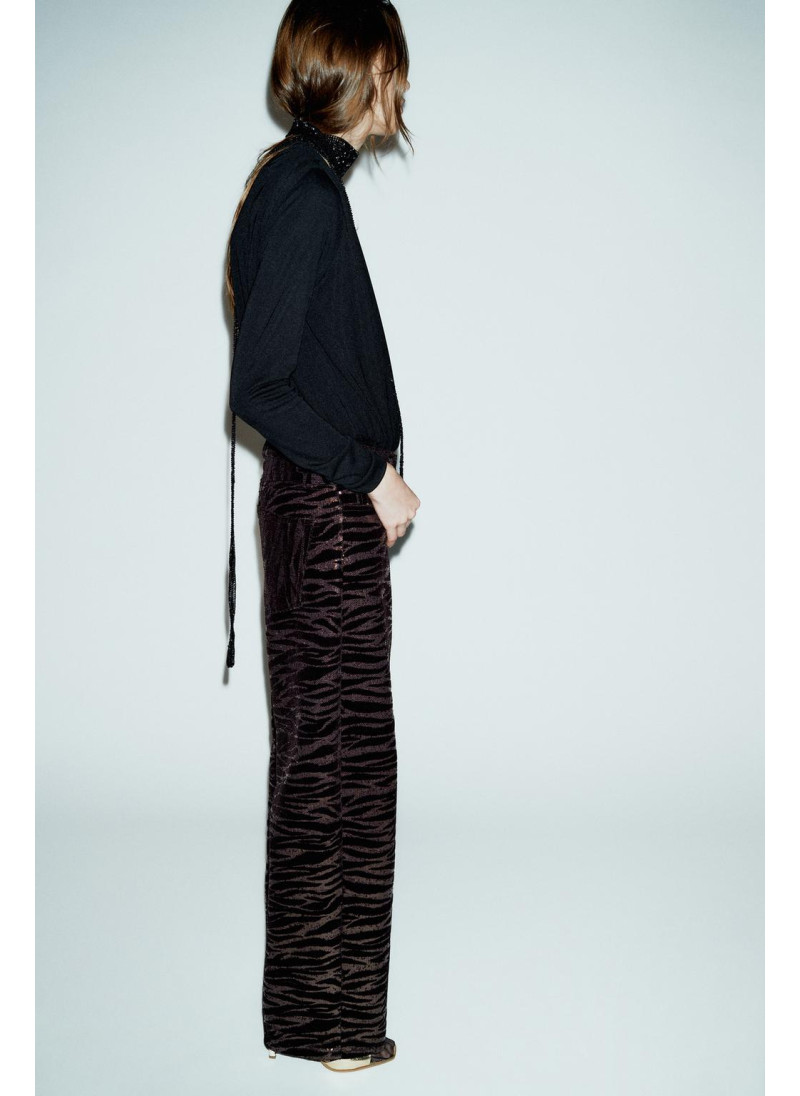 Брюки с высокой посадкой и пятью карманами. Комбинированная ткань: бархат и пайетки. Прямые длинные штанины. Застежка-молния и пуговица спереди.