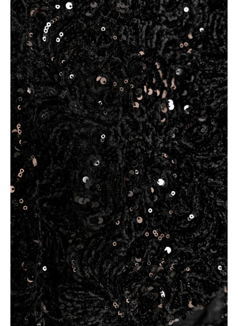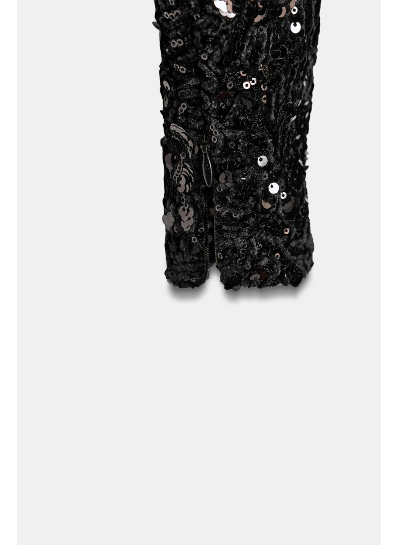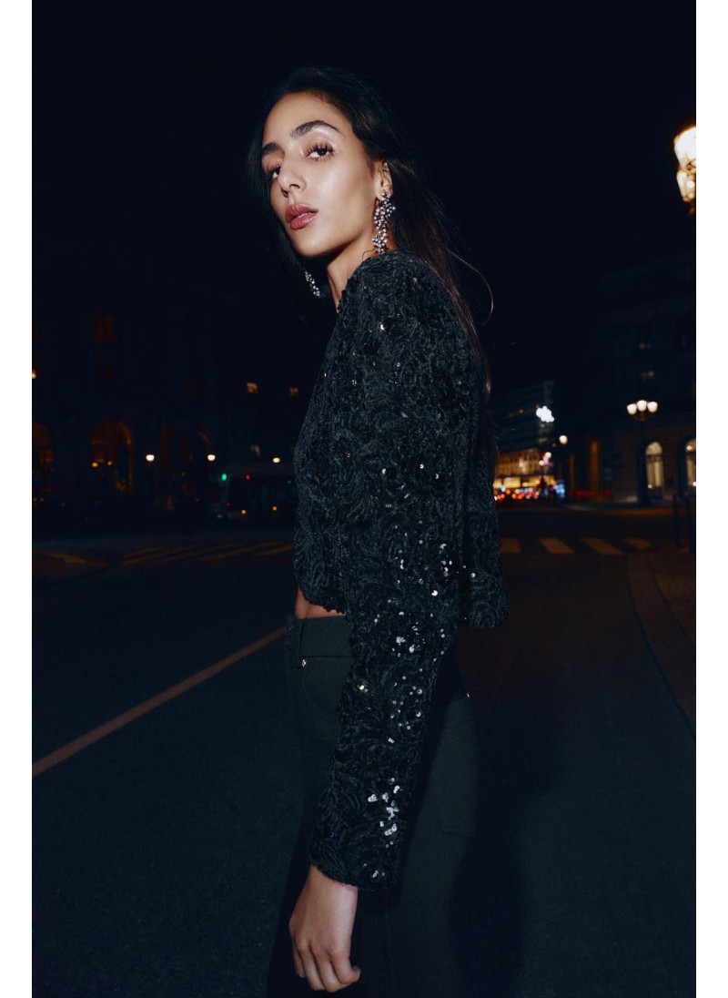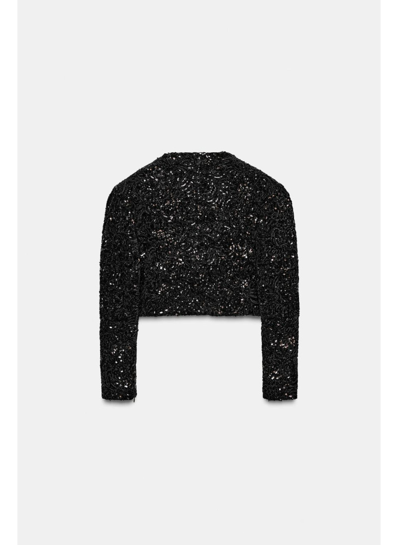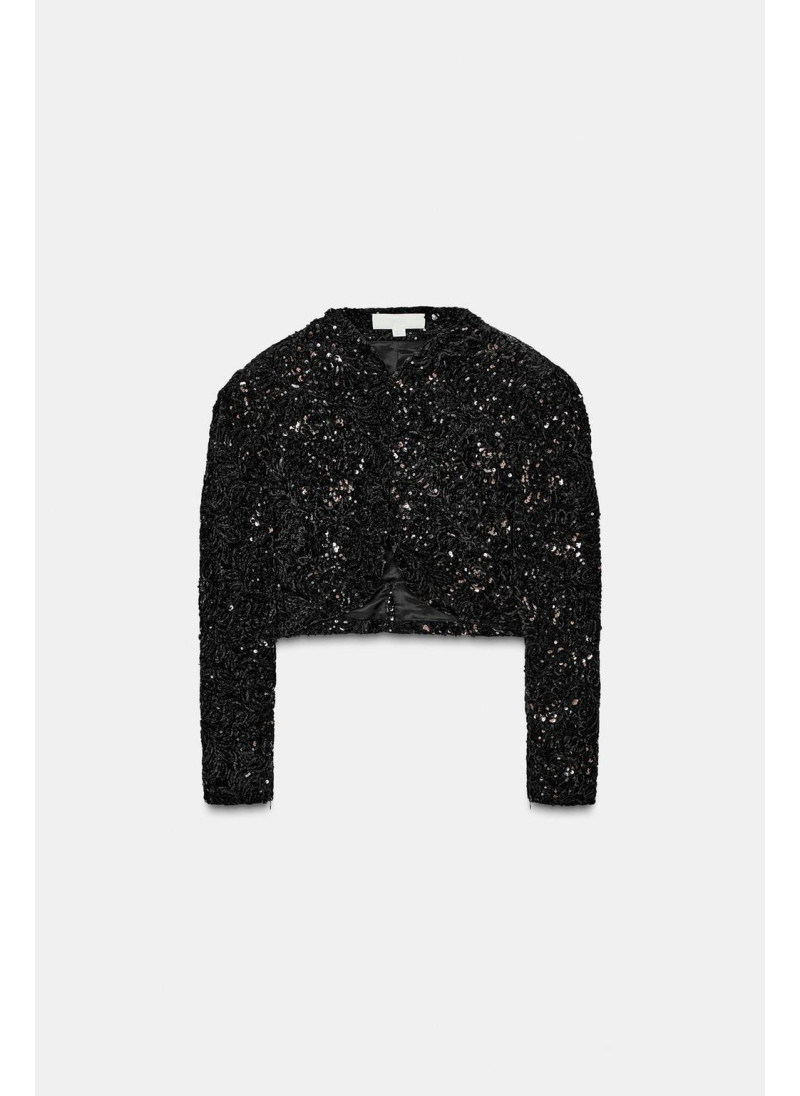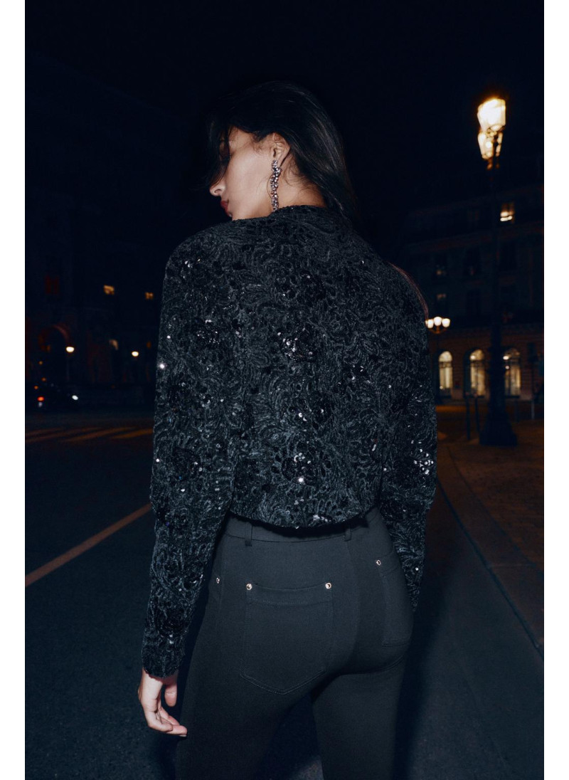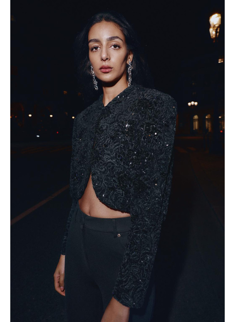 Пайетировый жакет. V-образный вырез и длинный рукав с наплечниками и манжетами на скрытой молнии. Нижний край с разрезом на спинке. Застежка спереди на скрытые крючки.