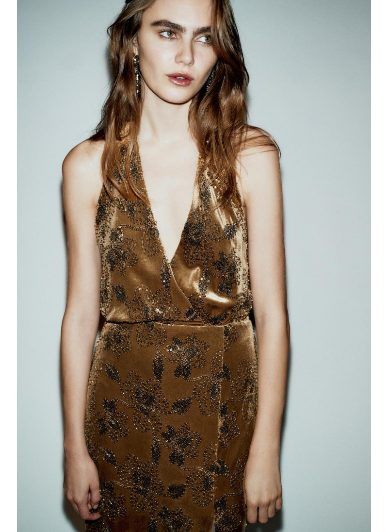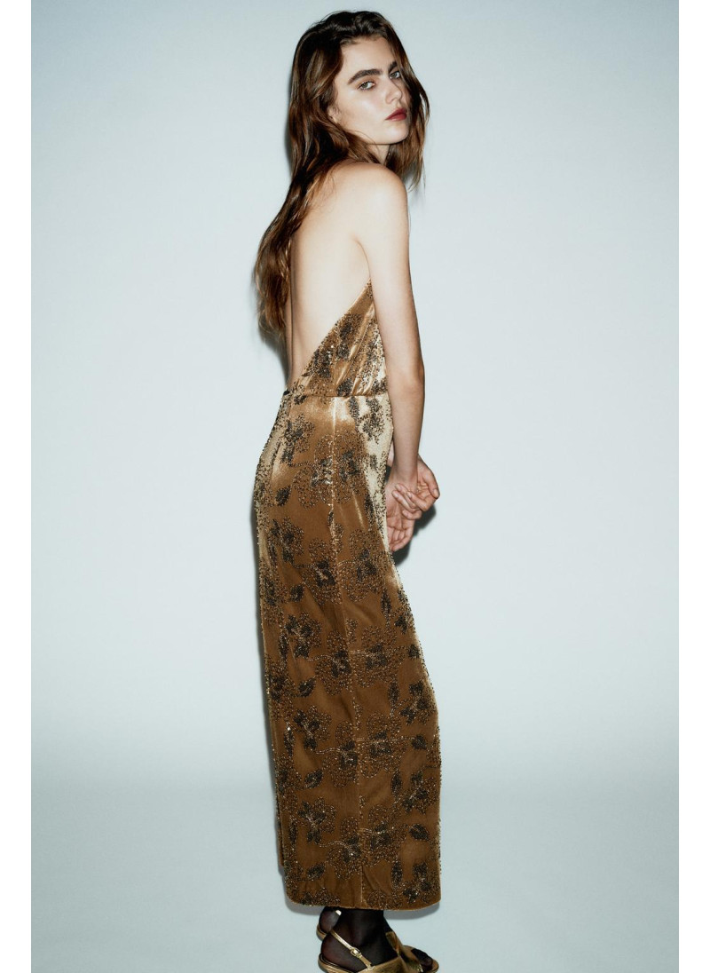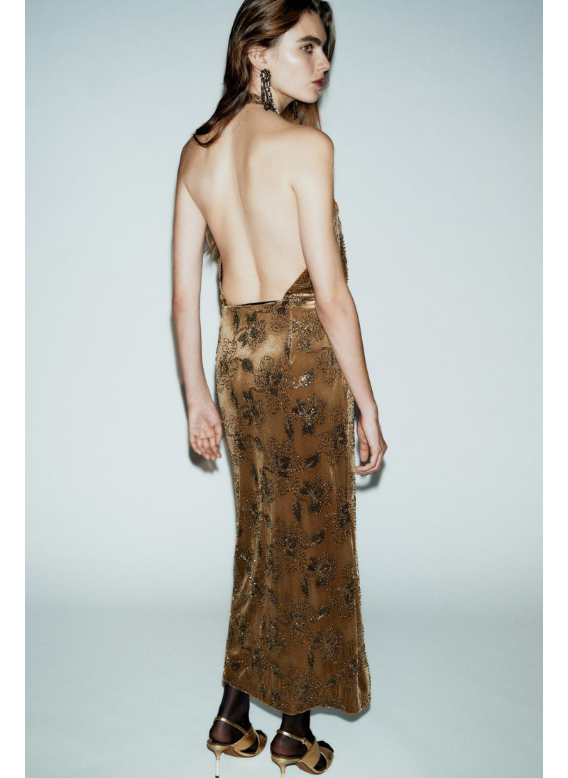 Платье с воротником халтер, перекрестным V-образным вырезом и открытой спиной. Детали из бусин и пайеток. Внутренняя подкладка. Низ с разрезом спереди. Застежка сзади на потайные пуговицы.